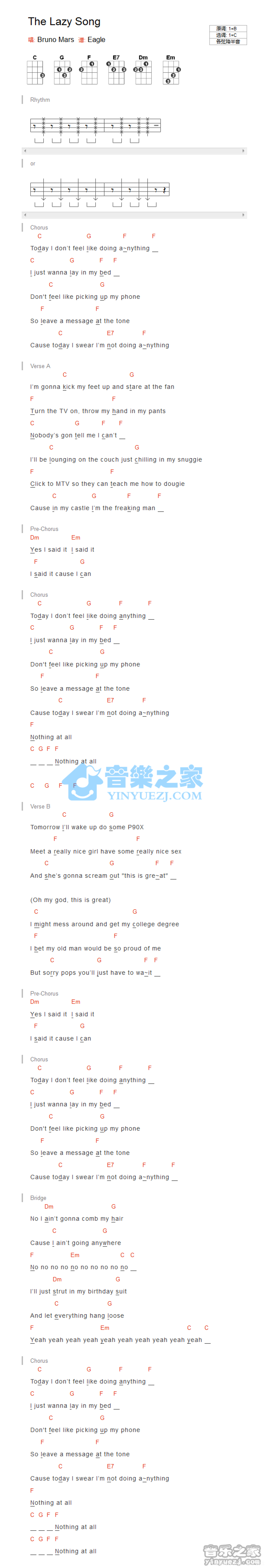 曲谱介绍: 《The lazy song》_C调尤克里里谱