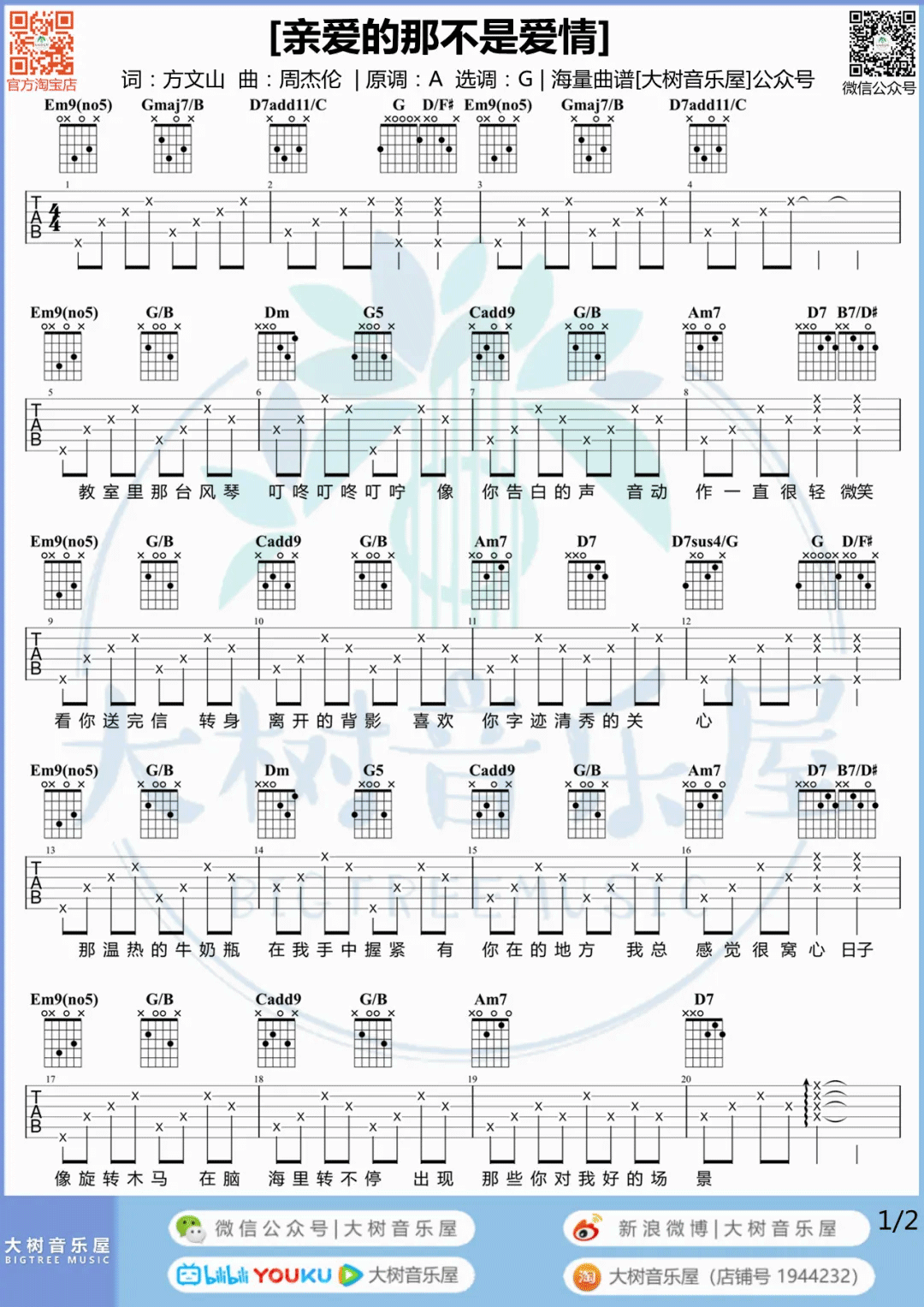 曲谱介绍: 《亲爱的那不是爱情》吉他谱_张韶涵_G调六线谱_吉他弹唱教学分享,《亲爱的那不是爱情》是由周杰伦作曲、张韶涵演唱的一首歌,据张韶涵透露,这首歌是周杰伦在十分钟内写完的一首歌。张韶涵如精灵般的声音唱第一句的时候就可以把人拉回到少女朦胧情怀的学生时代,那种感觉好美好纯真。 吉他弹唱演示及视频教学