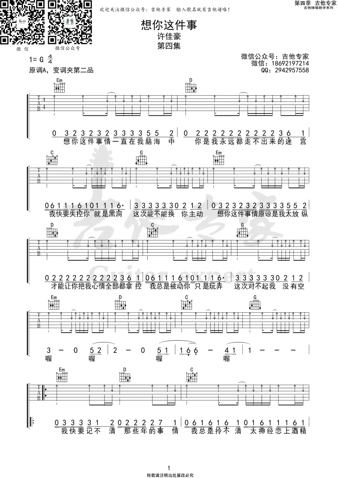 想你这件事吉他谱 - 烟(许佳豪) - G调吉他弹唱谱