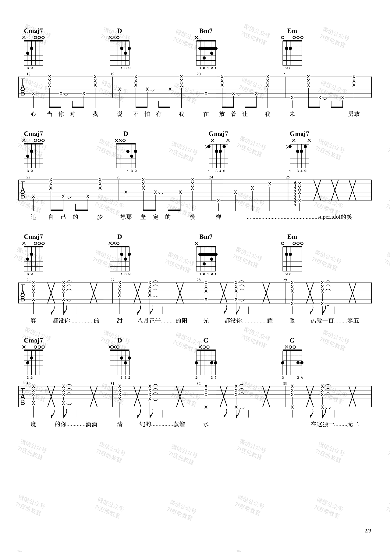 曲谱介绍: 《热爱105度的你》吉他谱_阿肆_G调六线谱_吉他弹唱演示分享,《热爱105度的你》是一首由阿肆创作并演唱的一首两年前的老歌,这首歌其实是阿肆为屈臣氏创作的一首广告歌曲。这里的曲谱来源于@7t吉他教室出品,原调为降B调,这里采用了G调指法进行编配,演唱时建议女生夹3品,男生可不夹,使用的和弦及节奏型都比较简单,对新手还是比较友好的。 吉他弹唱演示及视频教学