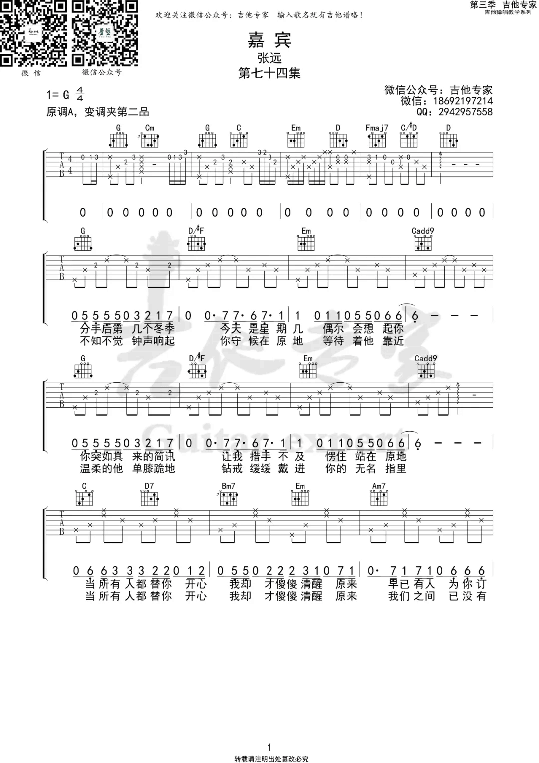 曲谱介绍: 嘉宾吉他谱_张远_《嘉宾》G调原版弹唱六线谱_高清图片谱分享,《嘉宾》是由张远演唱的一首歌曲,这首歌在网络上火的时间很长了。这是一首苦情歌,歌者所经历的都在歌词里写的明明白白,一个一直没有忘情男人,亲眼见证他的爱人正式开始新的生活,残忍,刻骨。