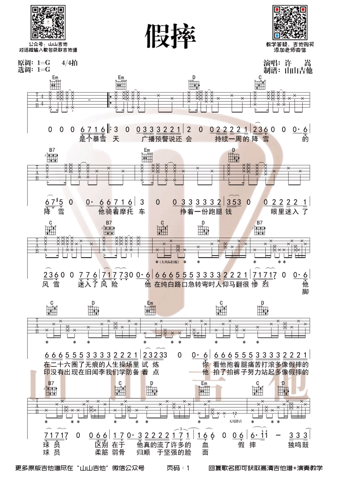 曲谱介绍: 假摔吉他谱_许嵩_《假摔》G调原版弹唱六线谱_高清图片谱分享,《假摔》是由许嵩作词作曲并演唱的一首最新歌曲,这首歌曲带有强烈的讽刺意味,都说互联网没有记忆。