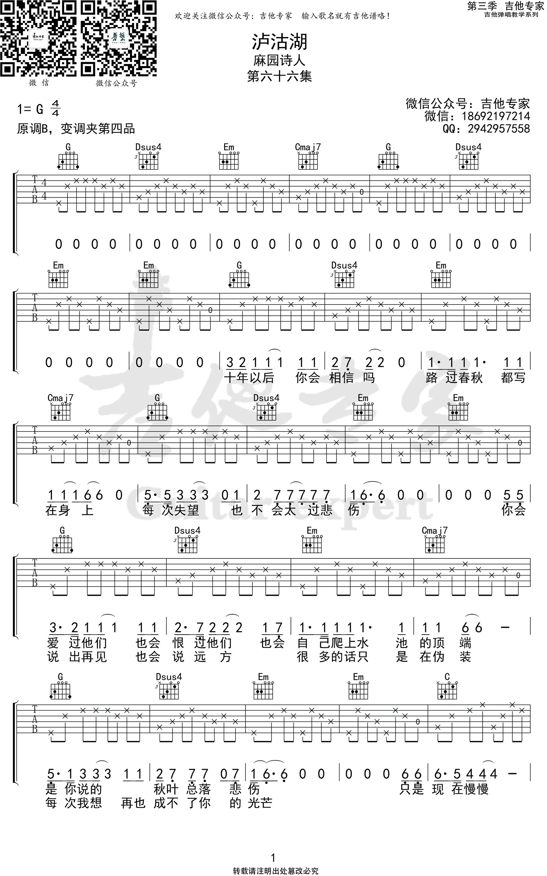 曲谱介绍: 泸沽湖吉他谱_麻园诗人_《泸沽湖》G调弹唱谱_高清六线谱分享,《泸沽湖》是由麻园诗人演唱的一首民谣风格的歌曲,这首《泸沽湖》延续了麻园诗人一贯的浪漫气质,忧伤也依旧贯穿其中。苦果说,相比之前的作品,这一张他们特别注意歌词的真实性,不想有故作高深或者为赋新词强说愁。歌曲原调为B调,这里采用了G调指法进行编配,演唱时可夹变调夹4品回到原调,歌曲整体难度比较小,容易练习。