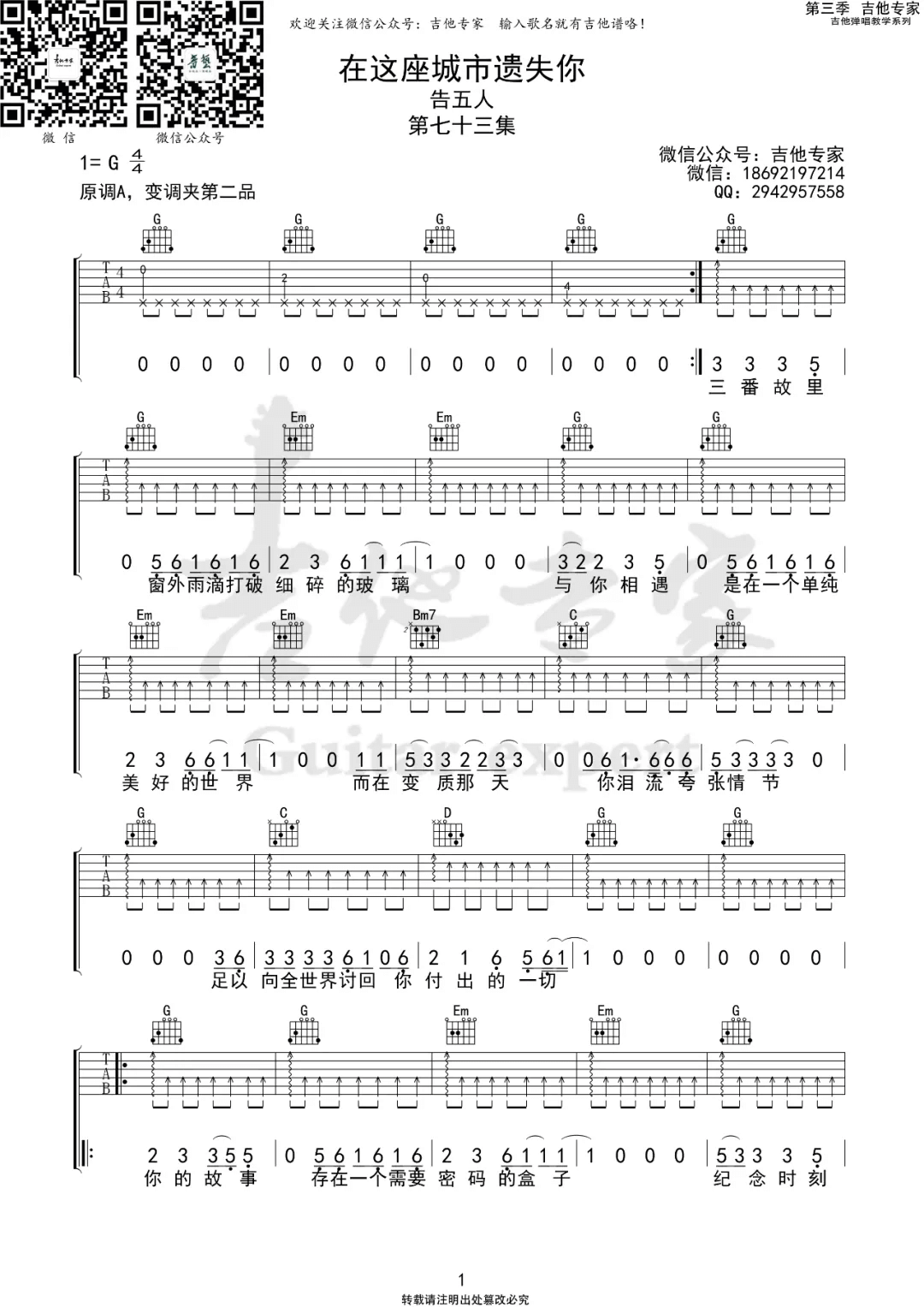 曲谱介绍: 《在这座城市遗失了你》吉他谱_告五人_G调弹唱谱_高清六线谱分享,《在这座城市遗失了你》是由告五人乐队演唱的一首歌曲,歌曲原调为A调,这里采用了G调指法进行编配,演唱时夹变调夹2品可回原调。全曲编配的节奏型及和弦都十分简单,比较容易练习。