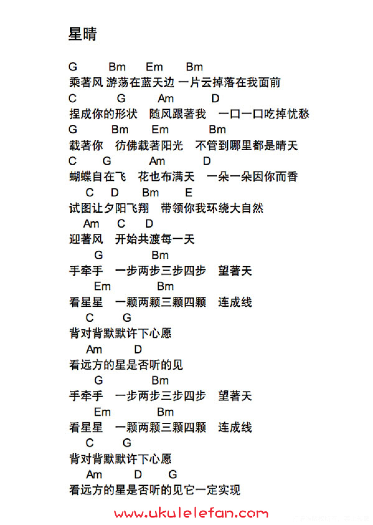 曲谱介绍: 周杰伦《星晴》_G调尤克里里谱