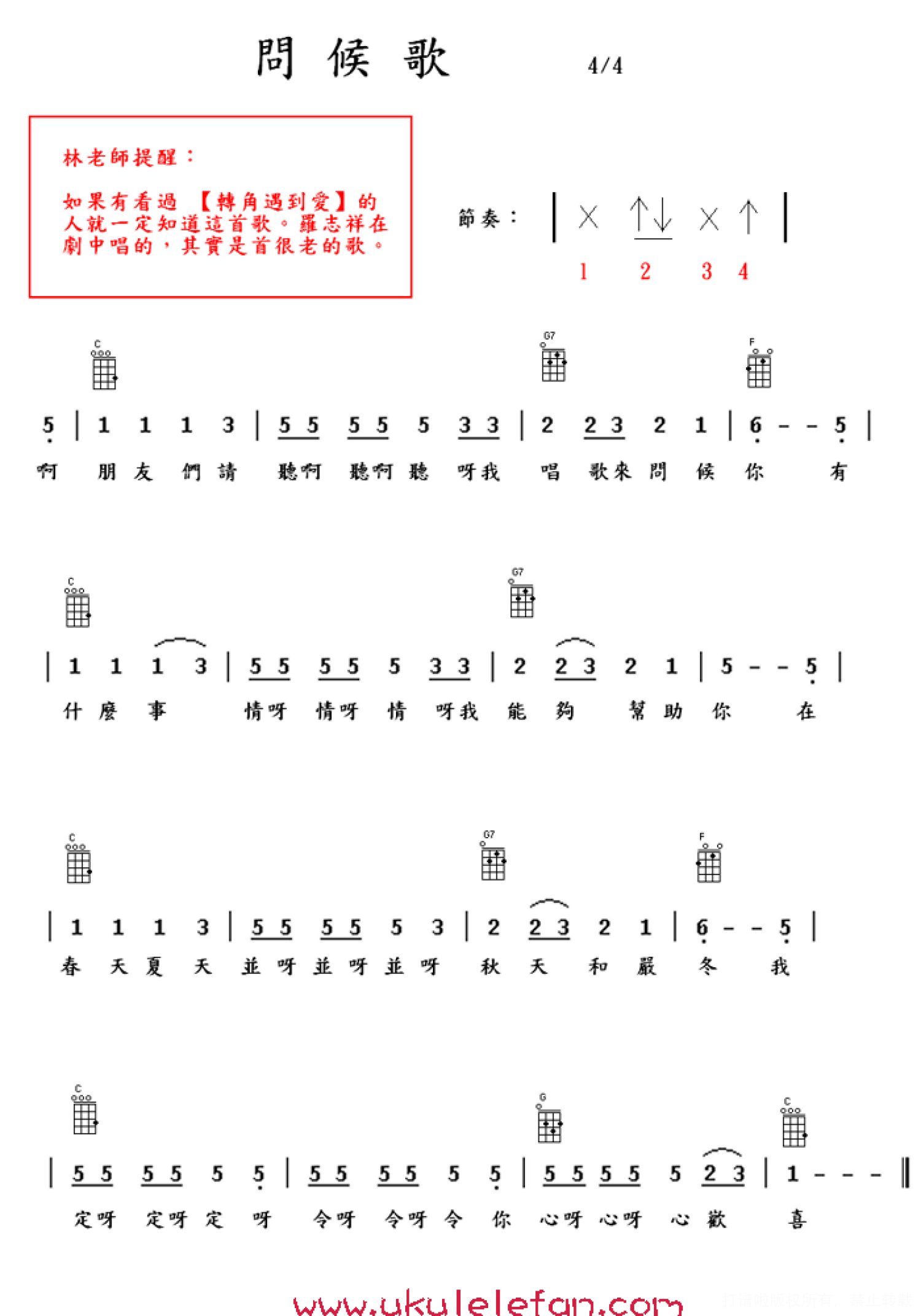 曲谱介绍: 《问候歌》_C调尤克里里谱