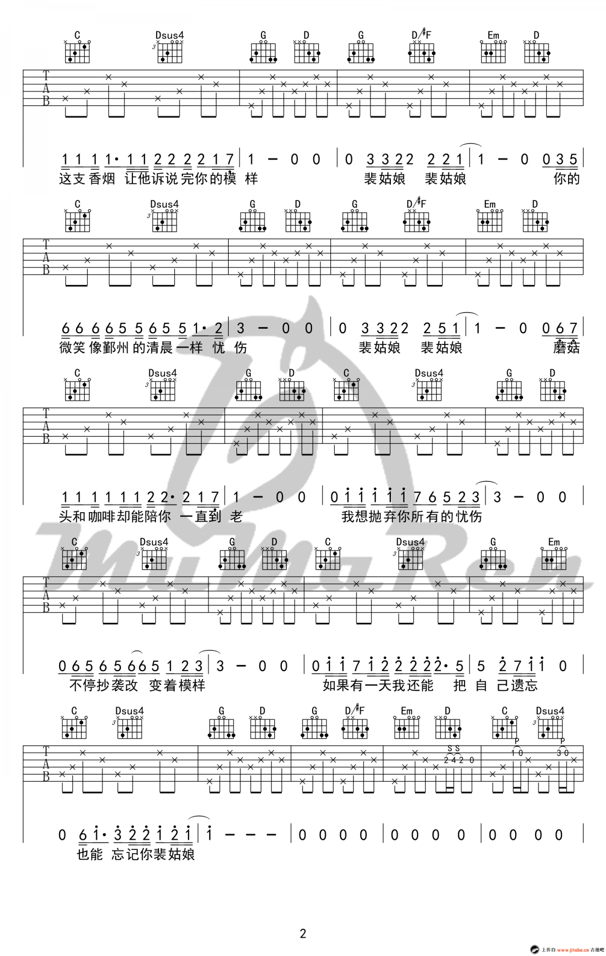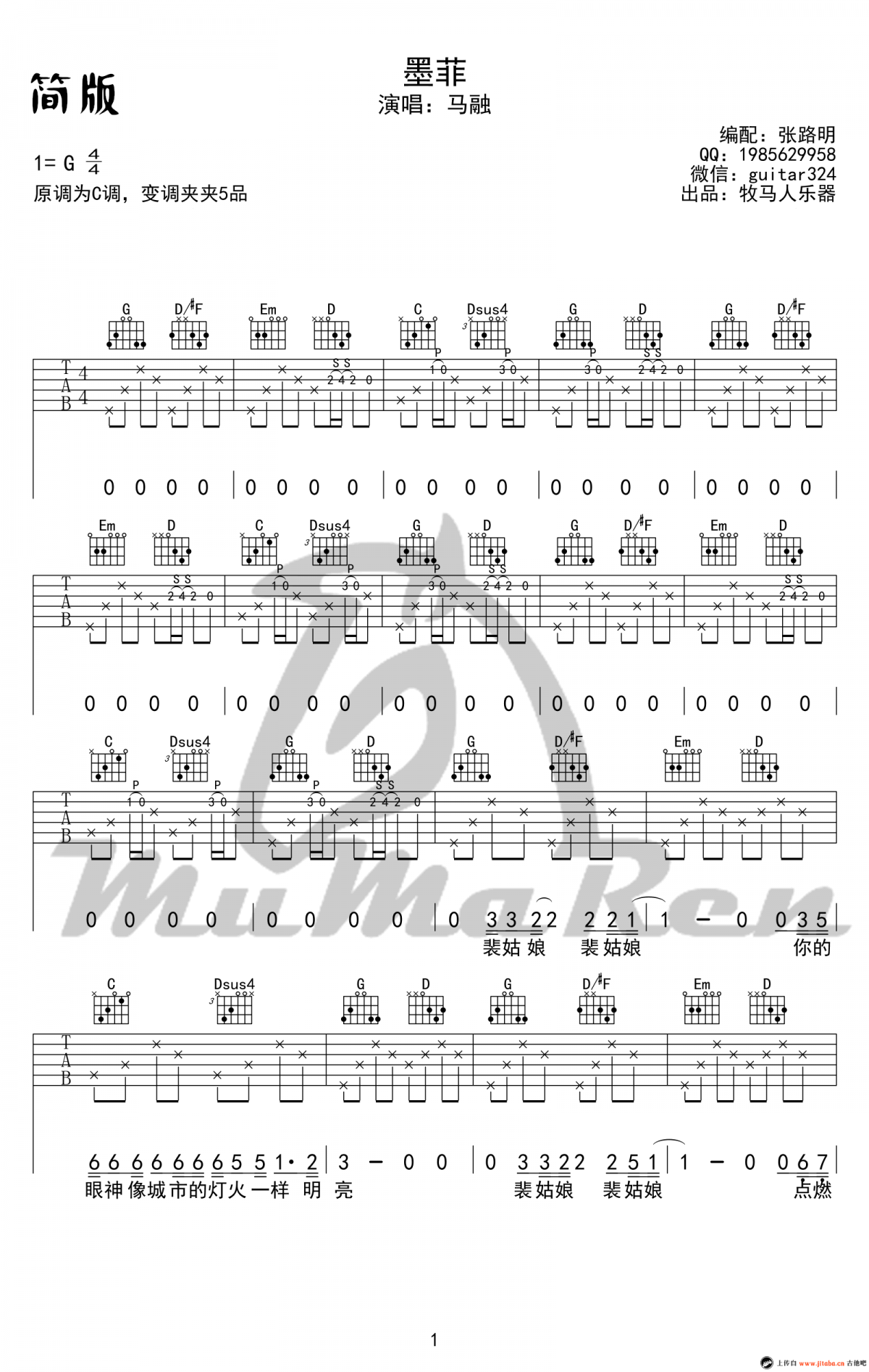 曲谱介绍: 马融《墨菲》吉他弹唱谱,采用G调指法编配,共有2张高清图谱,免翻页排版设计。