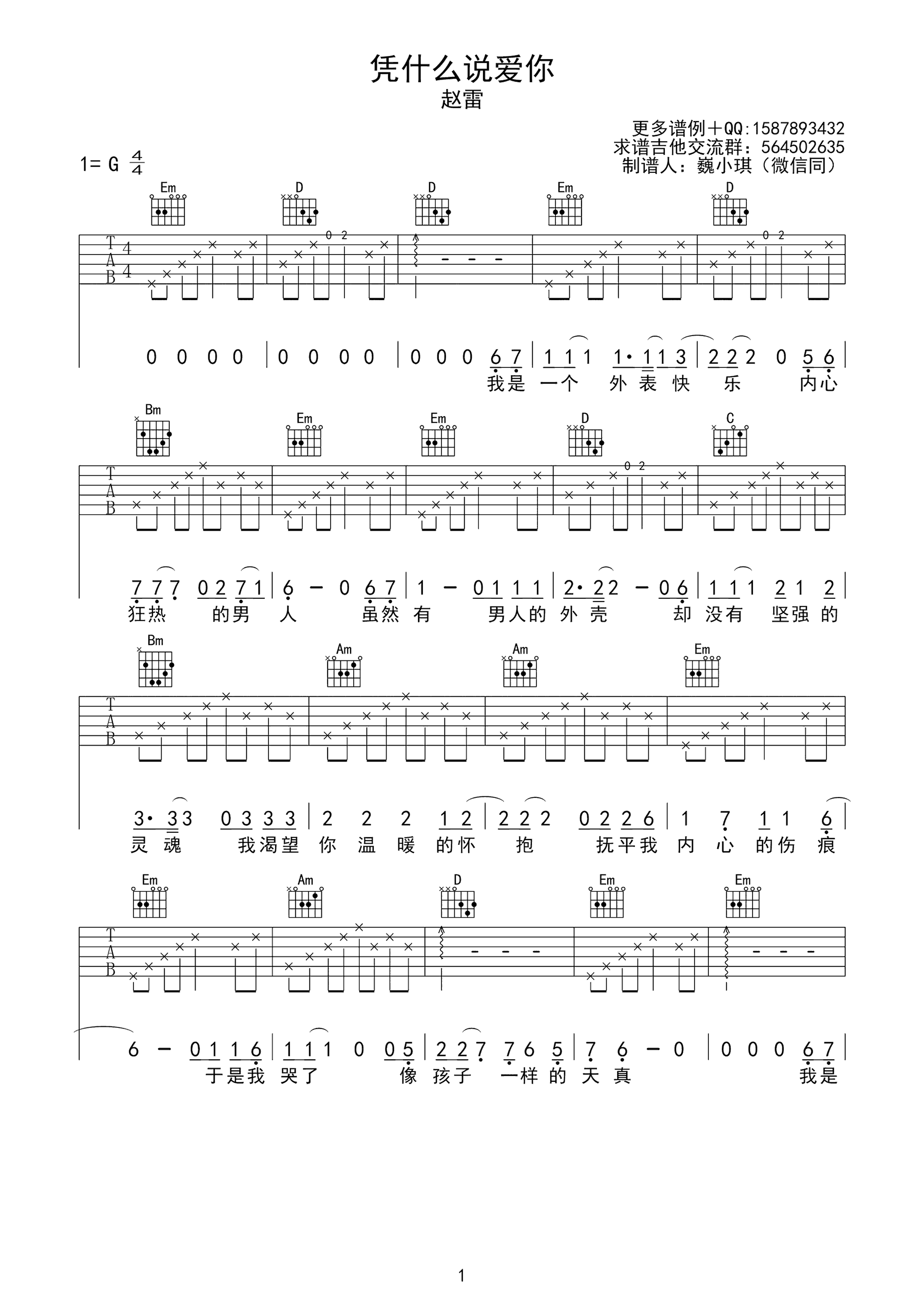 曲谱介绍: 凭什么说爱你吉他谱,并非赵雷原创作品,但依旧很赵雷,凭什么说爱你吉他弹唱谱现场版,四张图片谱,选用G调指法,感谢巍小琪的编配和提供,琴谱网推荐分享。