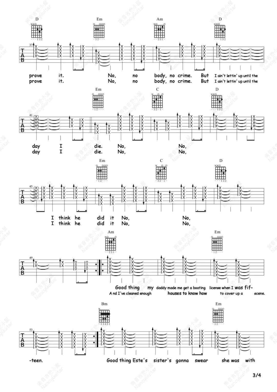 曲谱介绍: 《No Body No Crime》吉他谱_Taylor Swift_G调高清弹唱六线谱分享,《No Body No Crime》是由美国女歌手Taylor Swift(泰勒·斯威夫特)演唱的一首歌曲,这是一首带有黑暗的悬疑谋杀风格的歌曲,创作是将歌里的角色命名为Este之后进行的。歌词具有很强的叙事性,讲的是Swift与好友Haim姐妹一起为被谋杀的一名叫Este的妇女复仇,这个妇女发现她丈夫出轨并被其杀害。