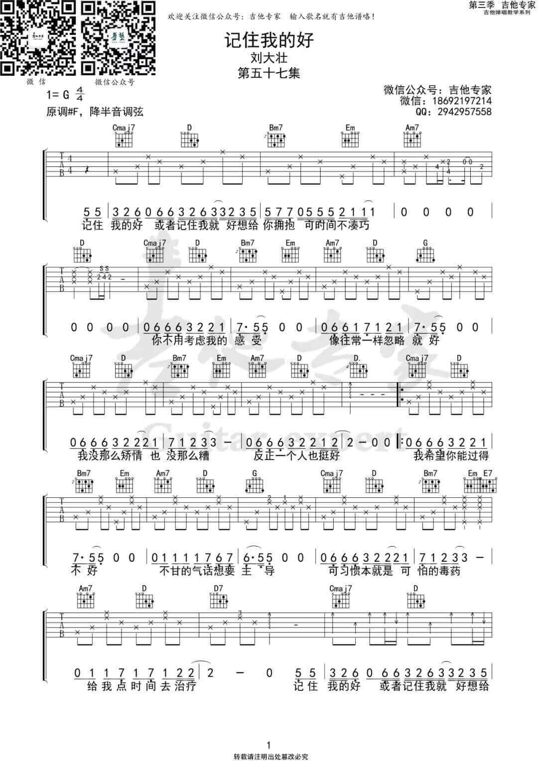 曲谱介绍: 《记住我的好》吉他谱_刘大壮_G调弹唱六线谱_高清图片谱分享,《记住我的好》是由刘大壮演唱的一首歌曲,我希望你记住我的好,如果你做不到,那你记住我来过,你的世界也好,十分好听煽情的一首歌。歌曲原调为#F调,这里采用了G调指法进行编配,演唱时降半音调弦,觉得麻烦也可以不调,整体指法及节奏型相对来说还比较简单,前奏和尾奏练习需要注意一下附点的问题。