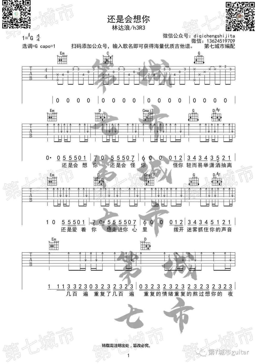 还是会想你吉他谱 - 林达浪/h3R3 - G调吉他弹唱谱