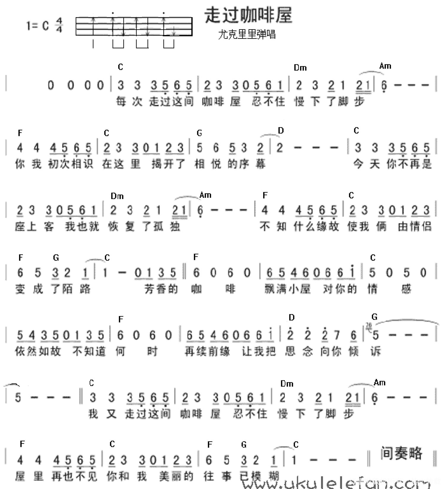 走过咖啡屋尤克里里谱 - 千百惠