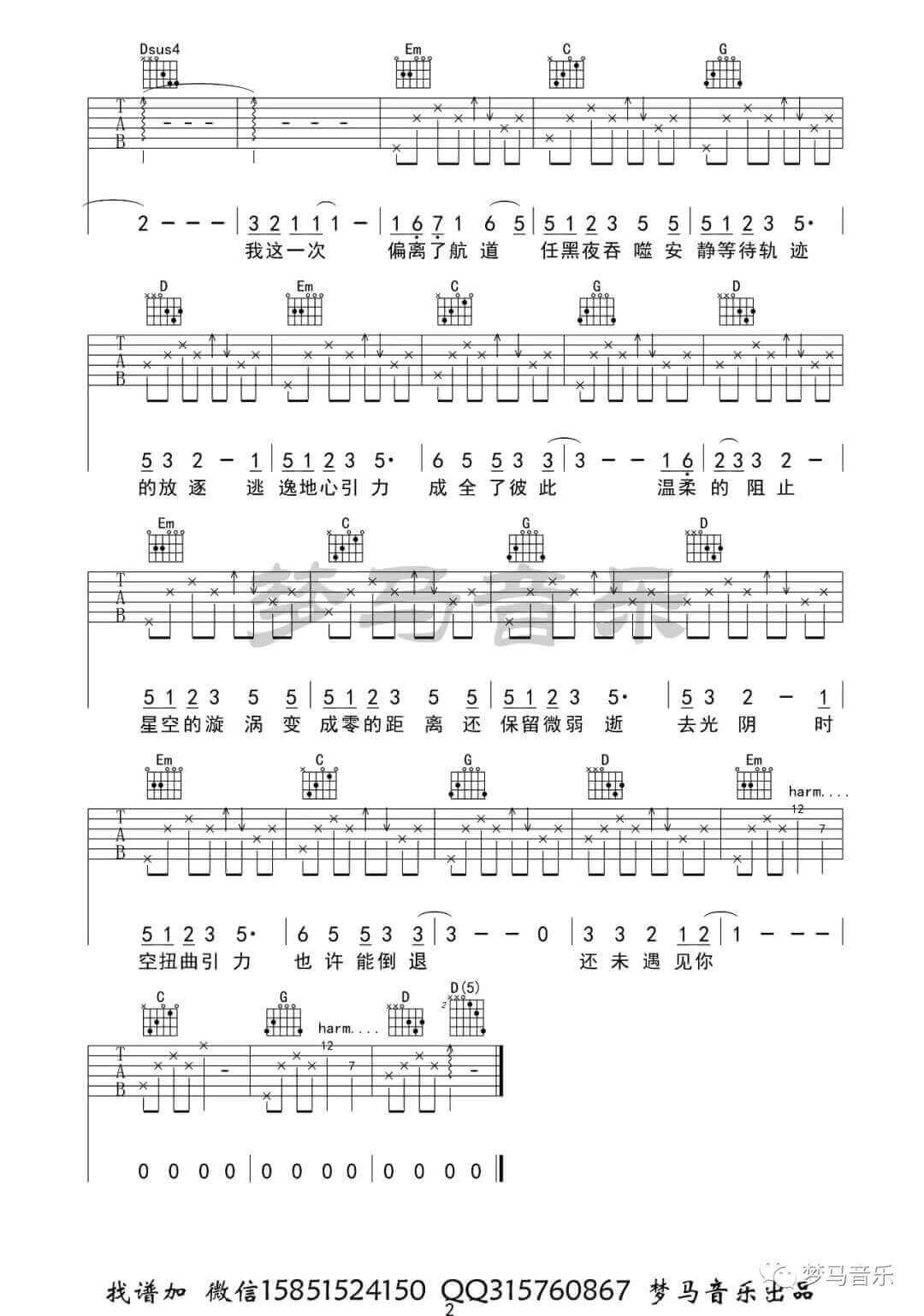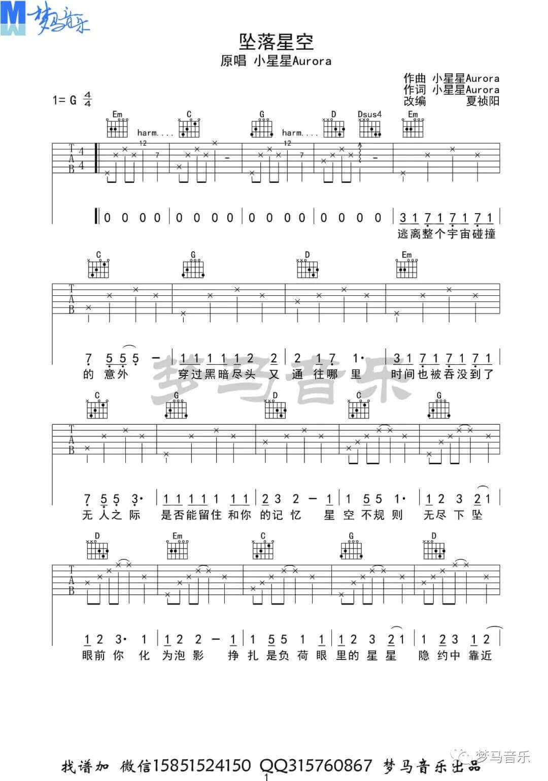 曲谱介绍: 《坠落星空》吉他谱_小星星Aurora_G调弹唱谱_高清六线谱分享,《坠落星空》是由小星星Aurora创作并演唱的一首歌曲,这首歌曲有着它独特的空灵 轻轻的在耳边吟唱 仿佛让人置身于浩瀚的宇宙中 举手抬足之间皆是星星 浪漫而又美丽,让人沉醉。独特的嗓音,美妙的旋律,让这首歌迅速串红,获得不少听众的喜欢。这里由@梦马音乐编配制谱,歌曲采用G调指法编配,和弦和指法都很简单,比较容易练习的一首歌。