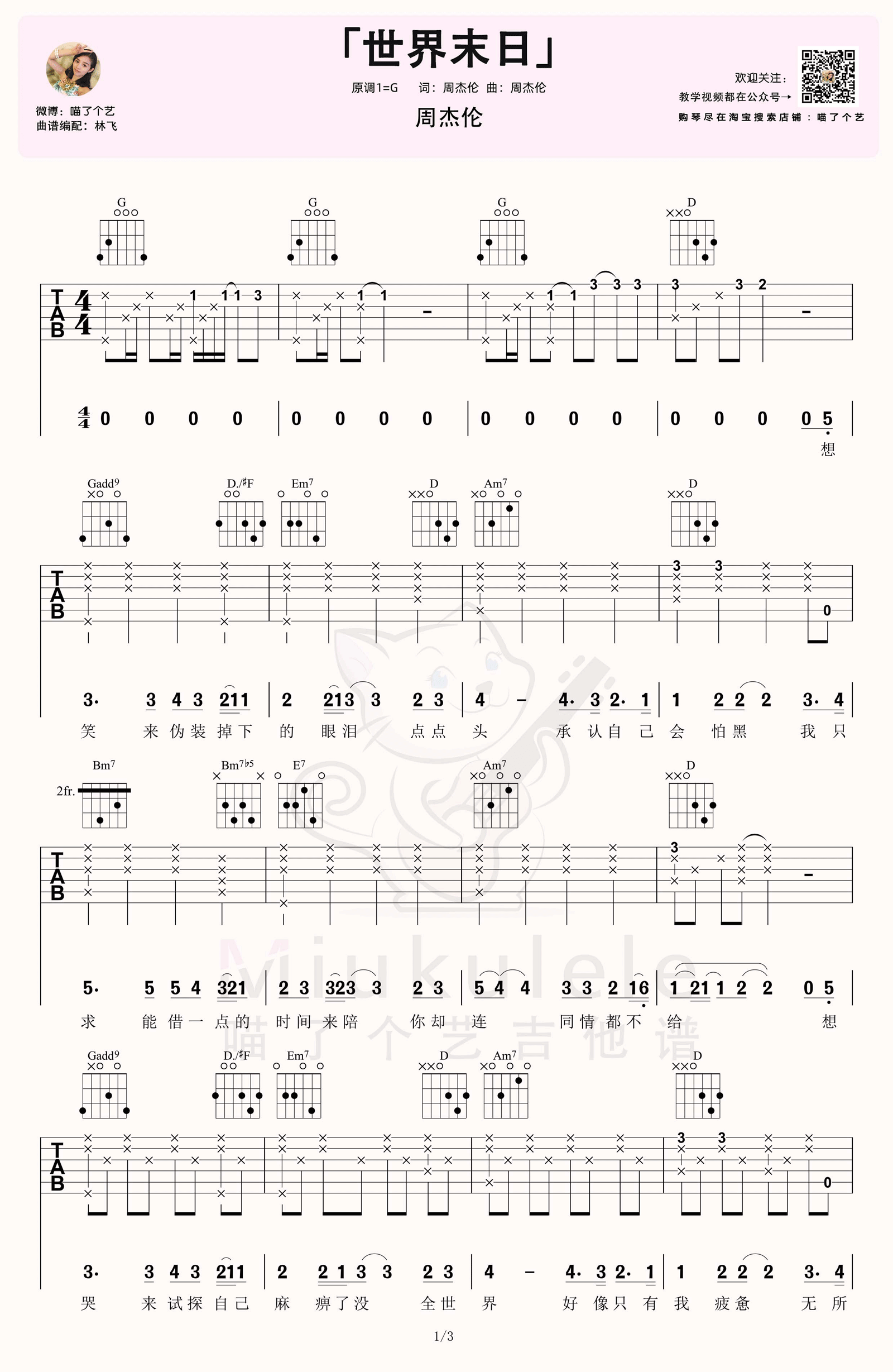 曲谱介绍: 《世界末日》吉他谱_周杰伦_G调原版编配_高清弹唱六线谱分享,《世界末日》是由周杰伦作词、作曲的一首歌曲,最早由咻比嘟哗组合演唱,后周杰伦也自己演唱了这首歌。
