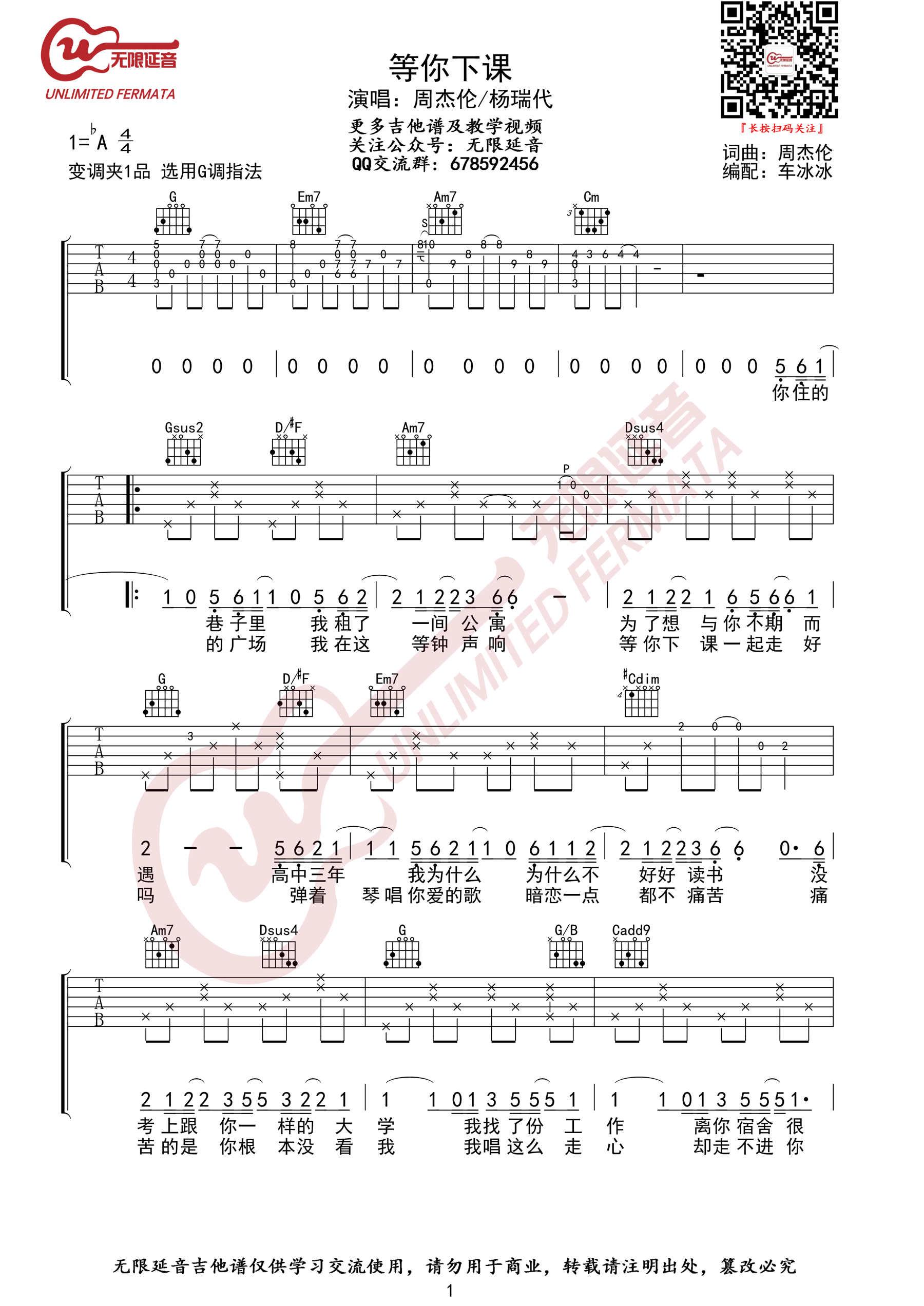 等你下课吉他谱 - 周杰伦/杨瑞代 - G调吉他弹唱谱