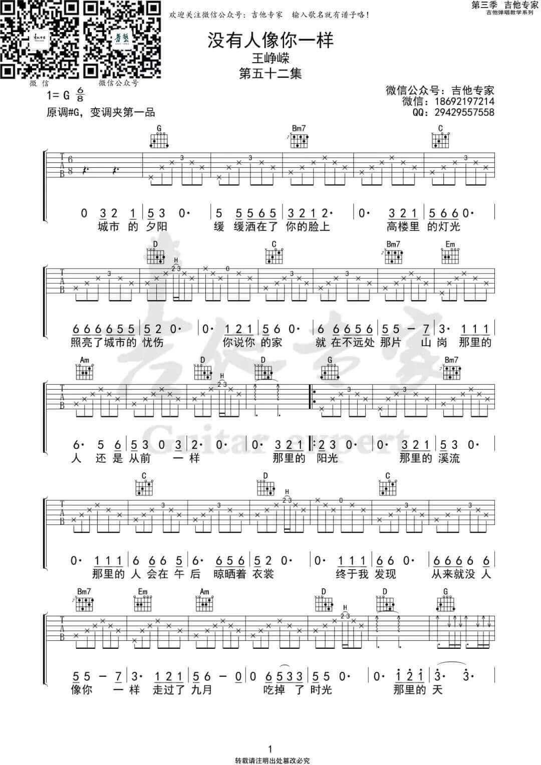 没有人像你一样吉他谱 - 王峥嵘 - G调吉他弹唱谱