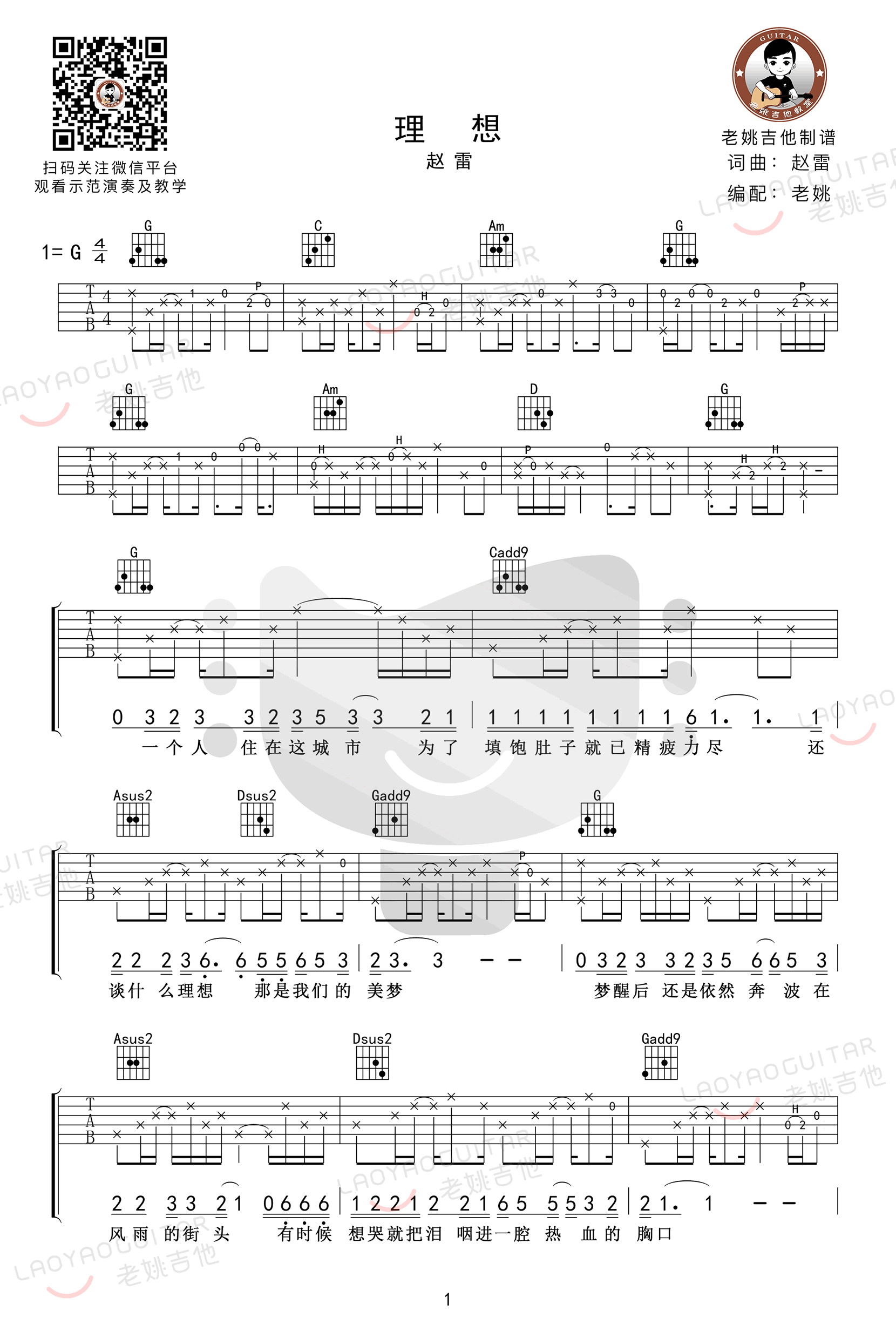 曲谱介绍: 理想吉他谱_赵雷_《理想》G调原版编配_吉他弹唱教学分享,《理想》是由中国民谣歌手赵雷填词、谱曲、演唱的一首原创歌曲,也是网剧《陈二狗的妖孽人生》的主题曲。这首歌总让人有一种就是抛弃都市生活,归隐山林的感觉。 吉他弹唱演示及视频教学