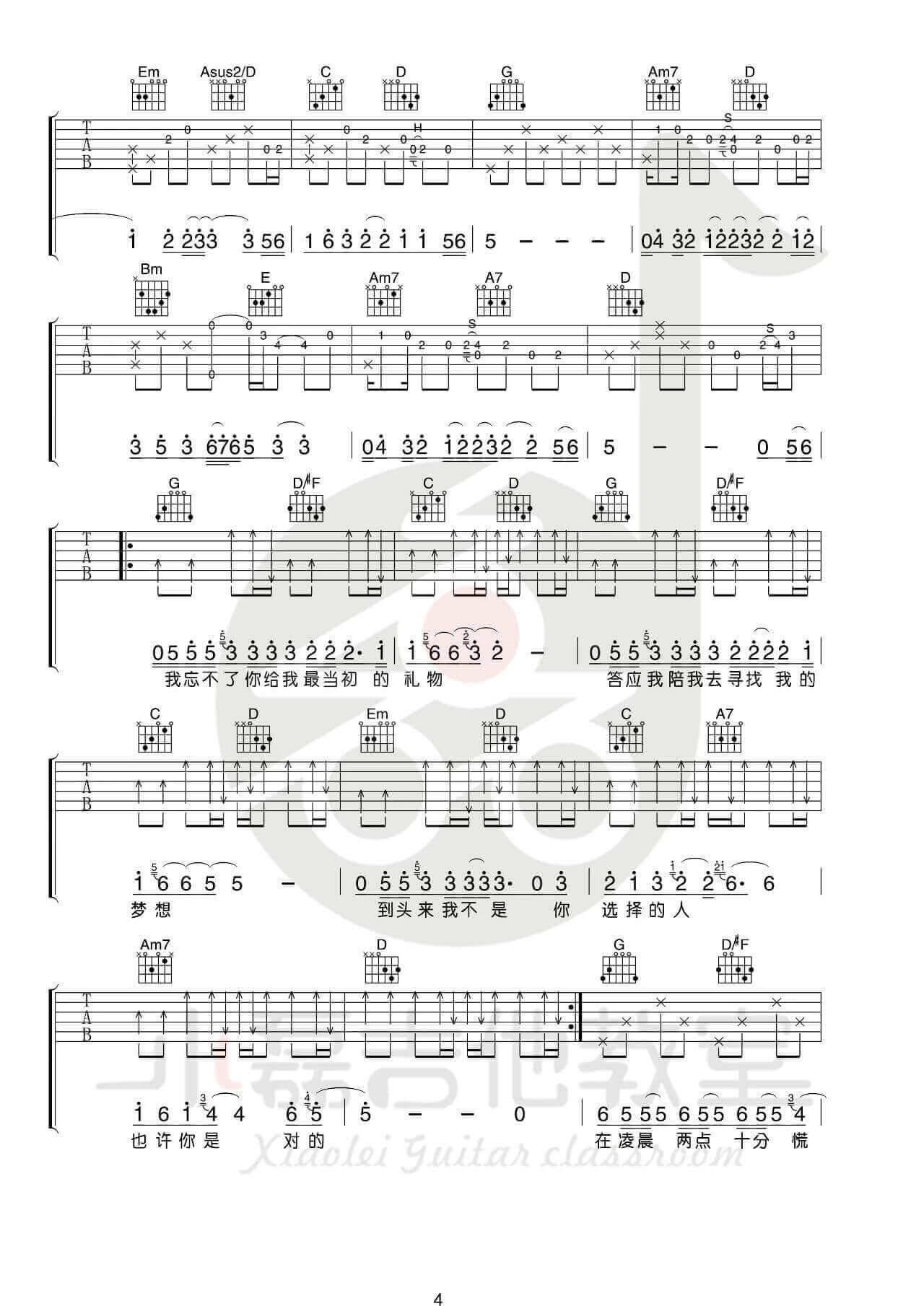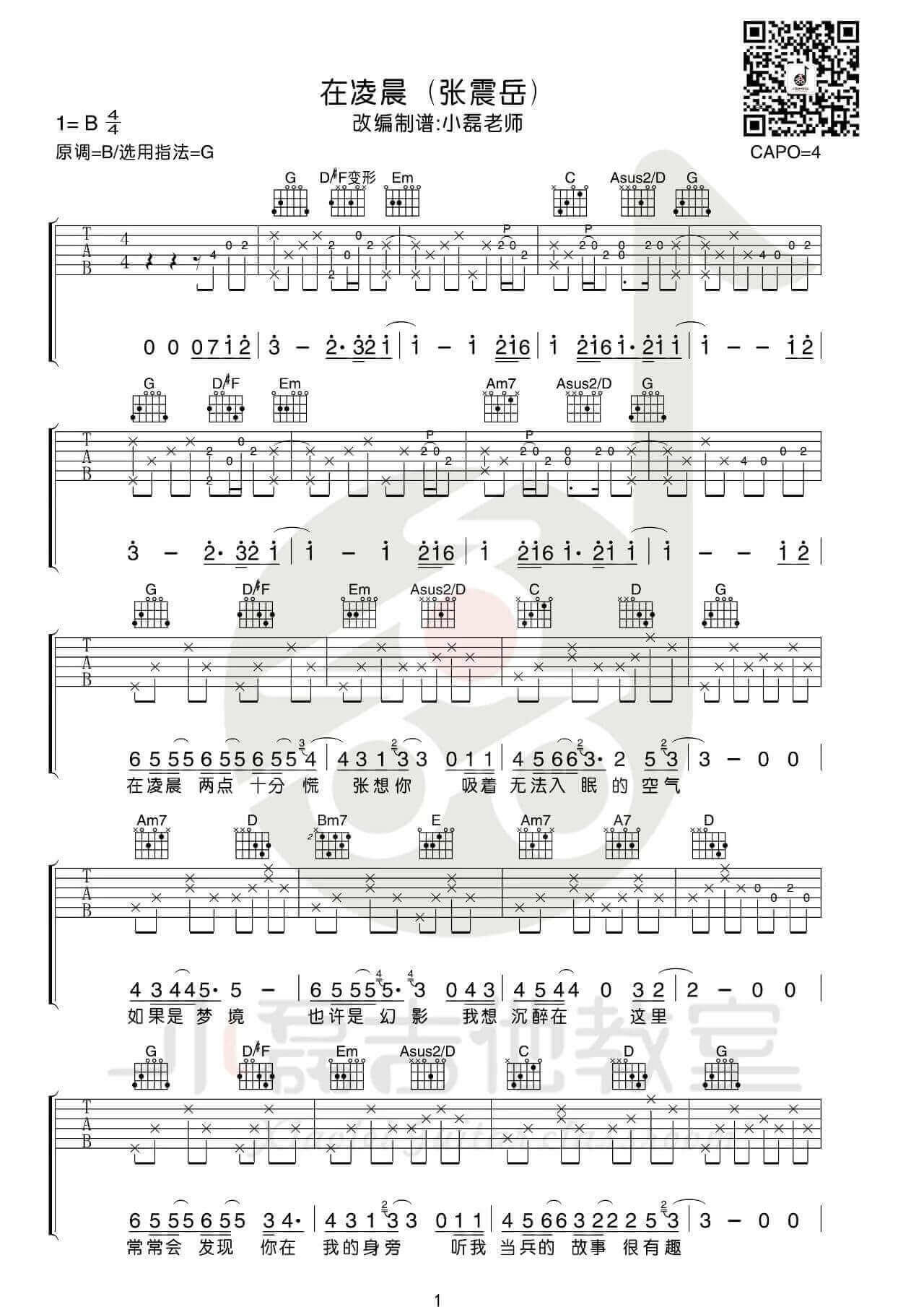 曲谱介绍: 《在凌晨》吉他谱_张震岳_G调原版六线谱_吉他弹唱教学分享,《在凌晨》是由张震岳作词作曲并演唱的一首歌曲,这是张震岳比较冷门的一首歌,但是却特别有学习和演奏意义,并且歌曲本身的寓意和旋律都非常好,很适合民谣弹唱,如果你也恰好喜欢这首歌,学习起来一定是一道风景线。歌曲采用G调指法进行编配,原调为B调,变调夹夹4品可回原调,整体难度不大,有不懂的地方可以参考小磊老师的吉他弹唱教学。 吉他弹唱演示及视频教学
