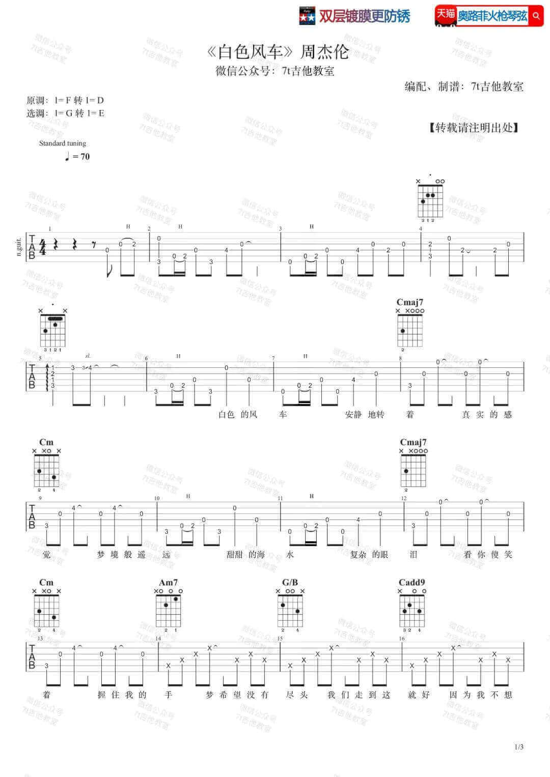 曲谱介绍: 《白色风车》吉他谱_周杰伦_G调弹唱六线谱_高清图片谱分享,《白色风车》是由周杰伦创作并演唱的一首歌曲,歌曲结构不同于周杰伦以往的流行情歌作品,段落堆叠和结构变化会导致内容记忆量增大,而且这首歌还涉及到转调,周杰伦为了一层层情绪的递进也是用尽各种技巧,然而这就意味着这首歌全程唱下来还是蛮费劲的,高音密集就不说了,关键是气接不上,换气频率越高,气息就越不容易平衡。