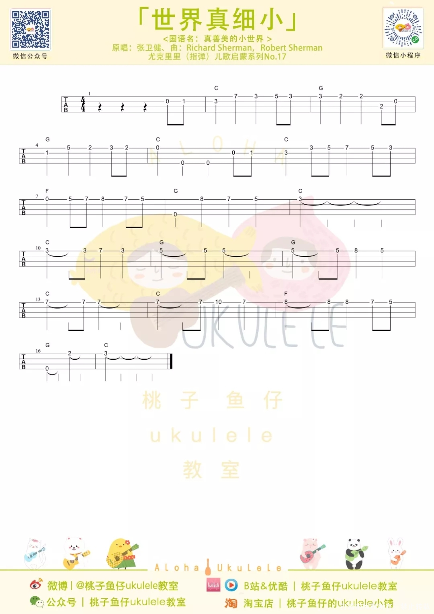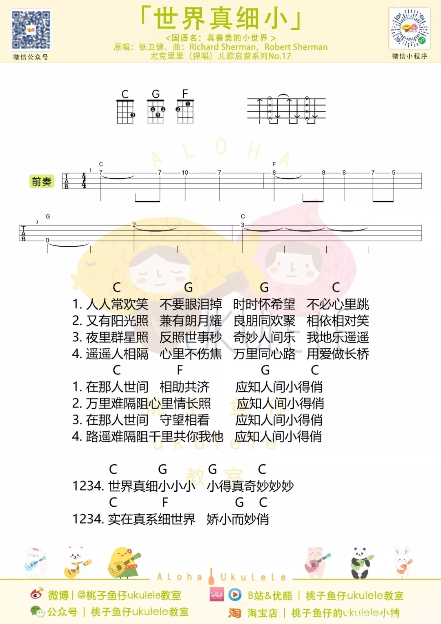 曲谱介绍: 世界真细~小~小~小~小得真奇~妙~妙~妙~~实在真系~细~世界~~娇小~而~妙~俏~~ ukulele示范+教学《世界真细小》是一首广东地区8090都耳熟能详的儿歌,歌词朗朗上口,十分可爱~(小编之前一直以为“真细小”是“真系小”会粤语的小伙伴有没有同感!)《真善美的小世界》是《世界真细小》的国语版,网上说这是一首以赞美迪斯尼乐园为主题的歌曲,谁能告诉我是为什么? 世界真细小ukulele指弹谱 世界真细小粤语版谱 国语版真善美的小世界ukulele谱  其他版本: