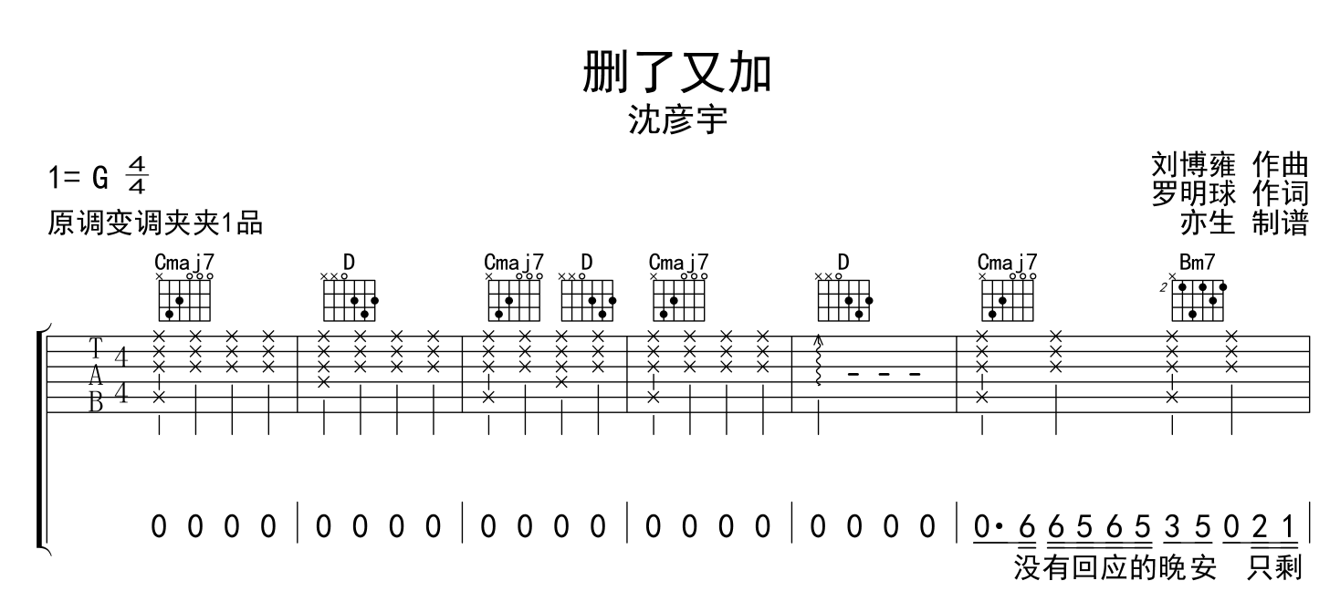 删了又加吉他谱 - 沈彦宇 - G调吉他弹唱谱 - 原版