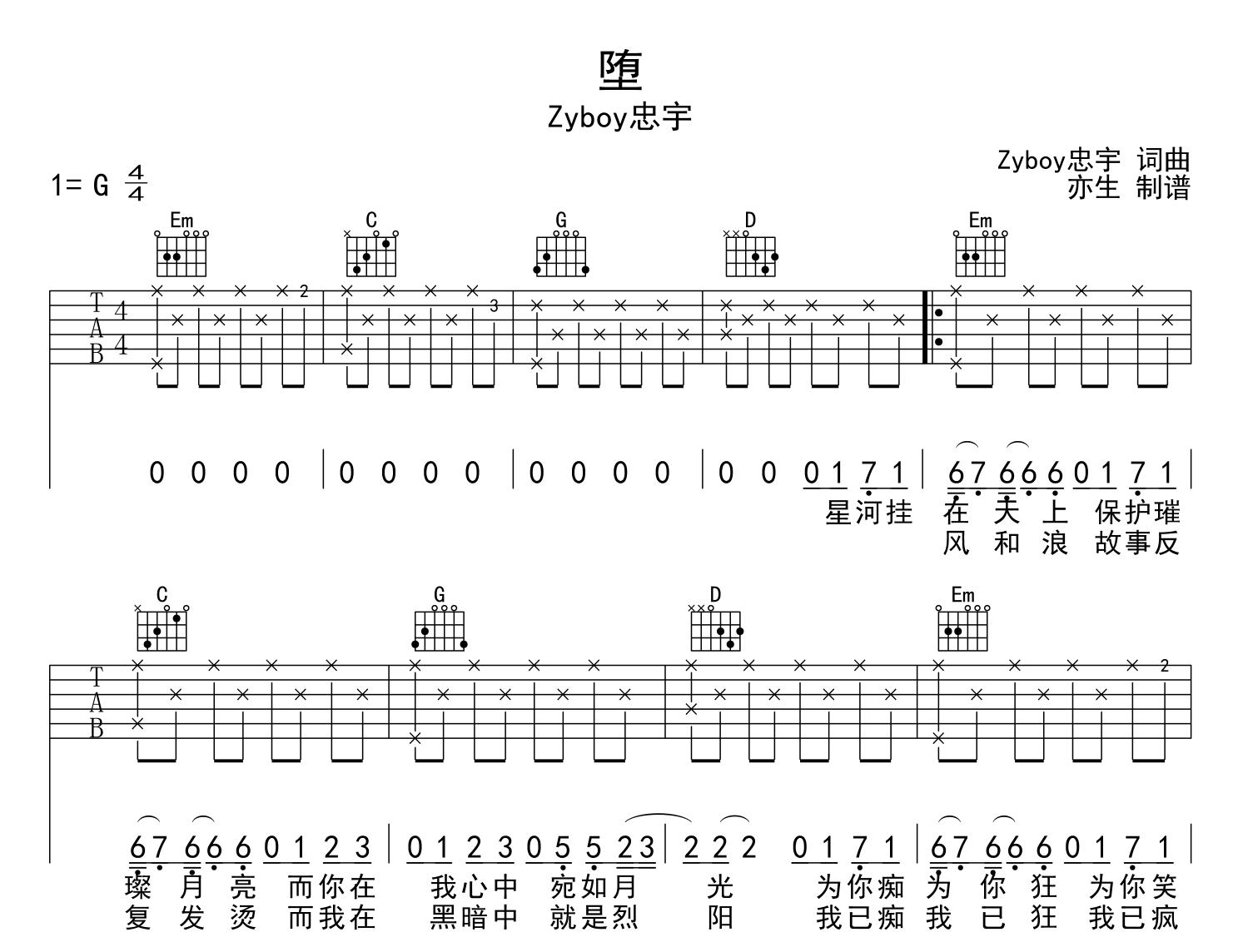 堕吉他谱 - zyboy忠宇 - G调吉他弹唱谱