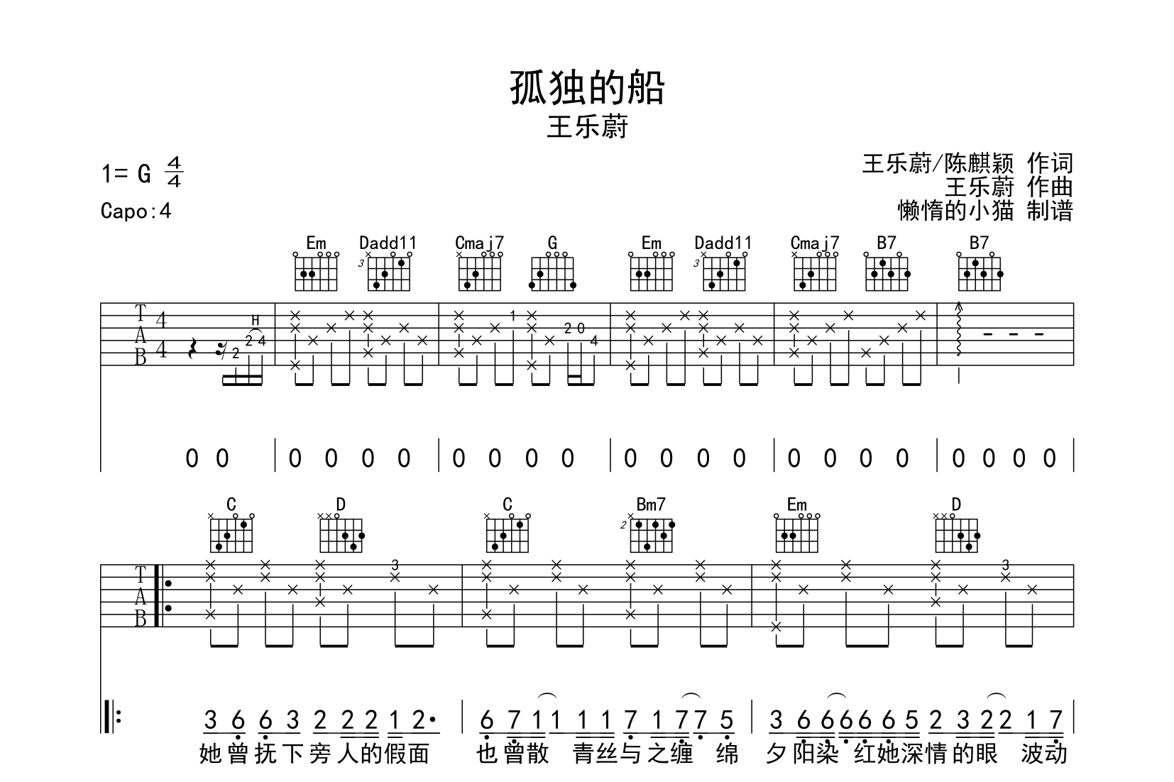 曲谱介绍: 孤独的船吉他谱,由王乐蔚演唱 吉他谱采用G调指法编配,变调夹夹第4品演奏,原调B调,也可以根据个人嗓音条件灵活选择变调夹,演奏的速度控制在每分钟70拍左右,本谱由懒惰的小猫制谱上传,