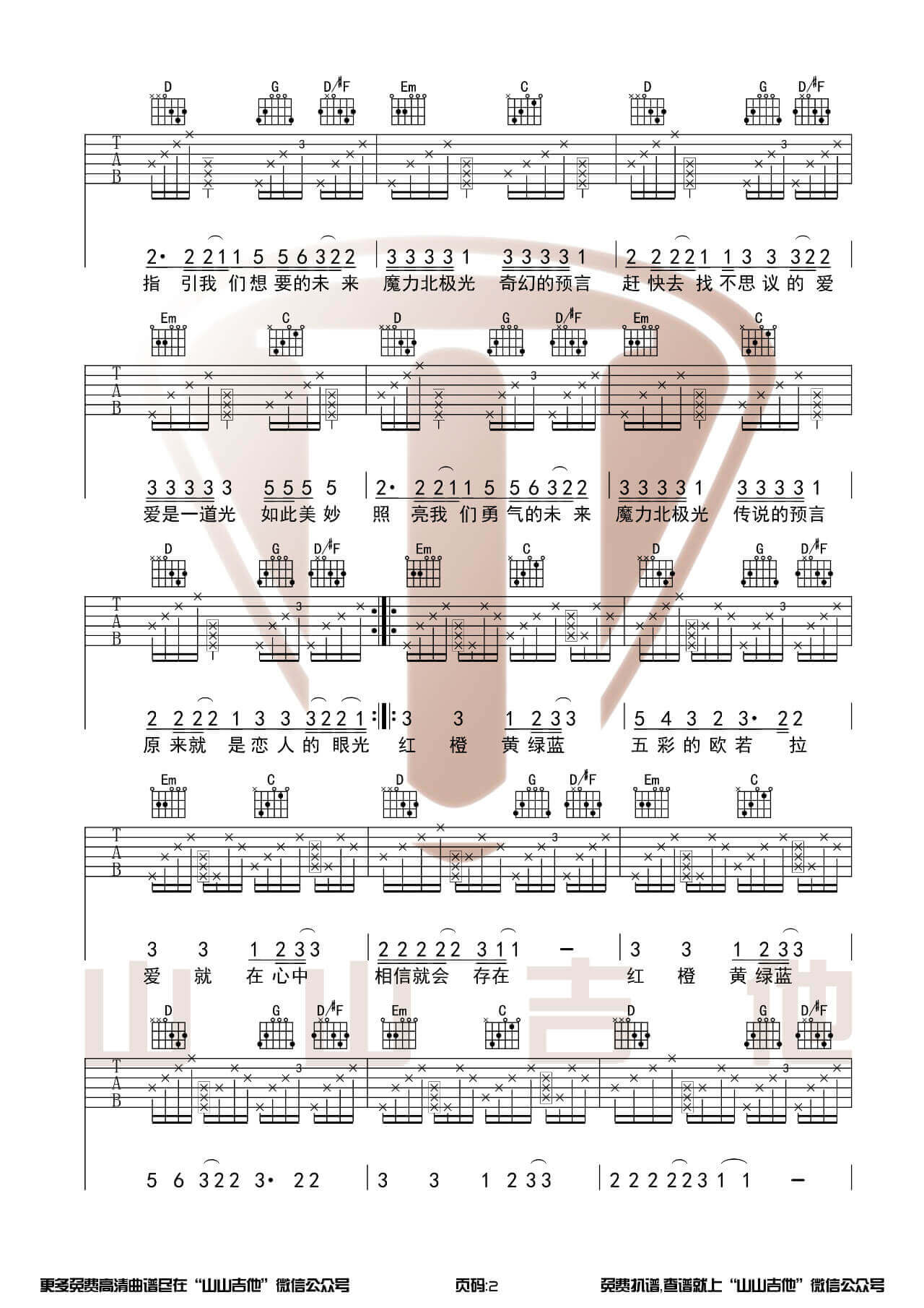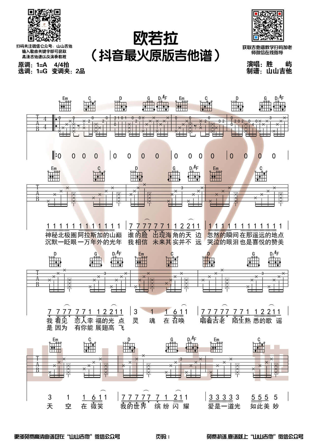 曲谱介绍: 最近的当红热门歌曲《欧若拉》,这首老歌被胜屿翻唱之后又出现在大众视野之中,在抖音上被众多网友引用为背景音乐,本文是来自山山吉他编配的《欧若拉》吉他谱,G调指法编配原版六线谱,附弹唱示范演示,带前奏版。 吉他弹唱演示及视频教学
