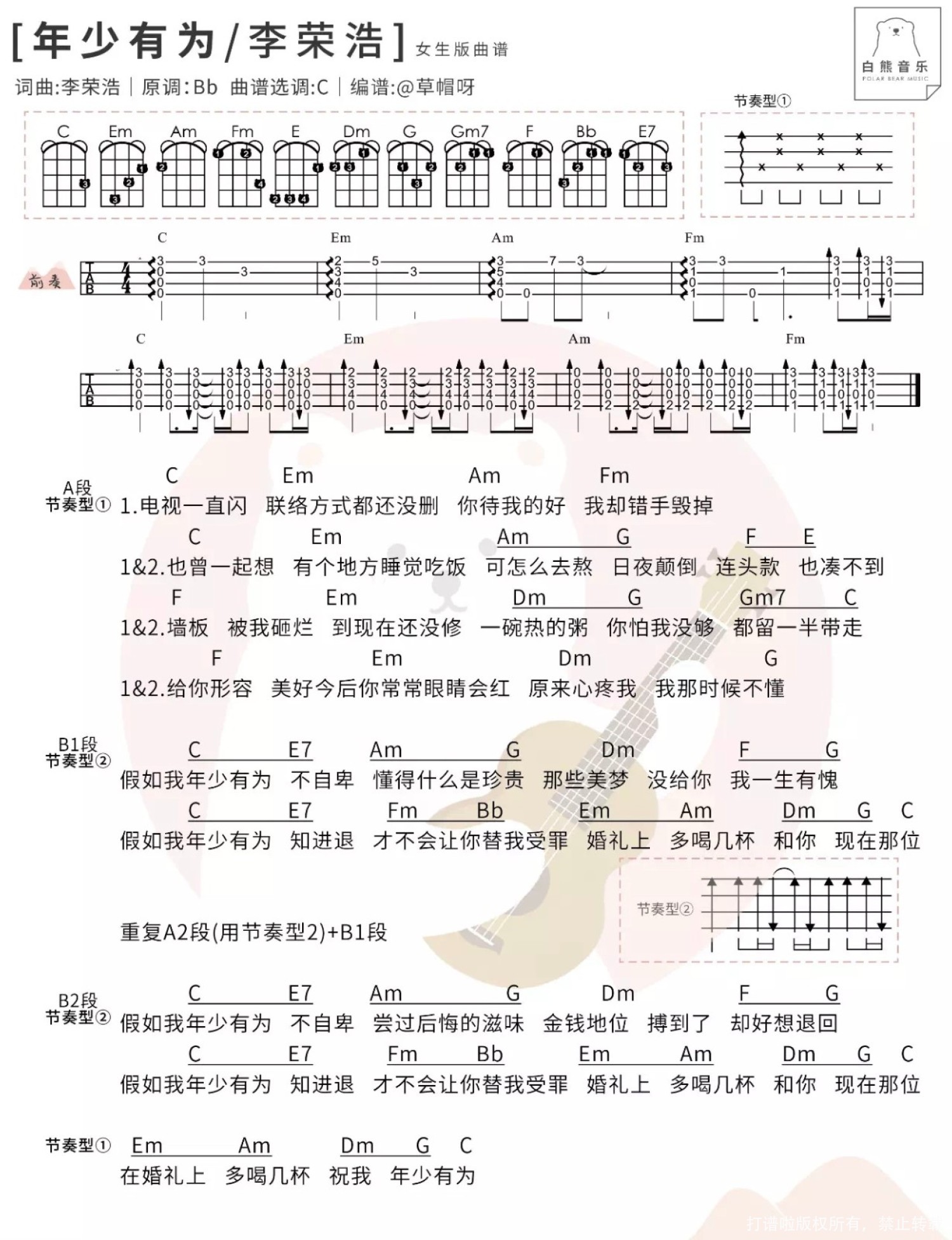 曲谱介绍: 李荣浩《年少无知》_C调尤克里里谱