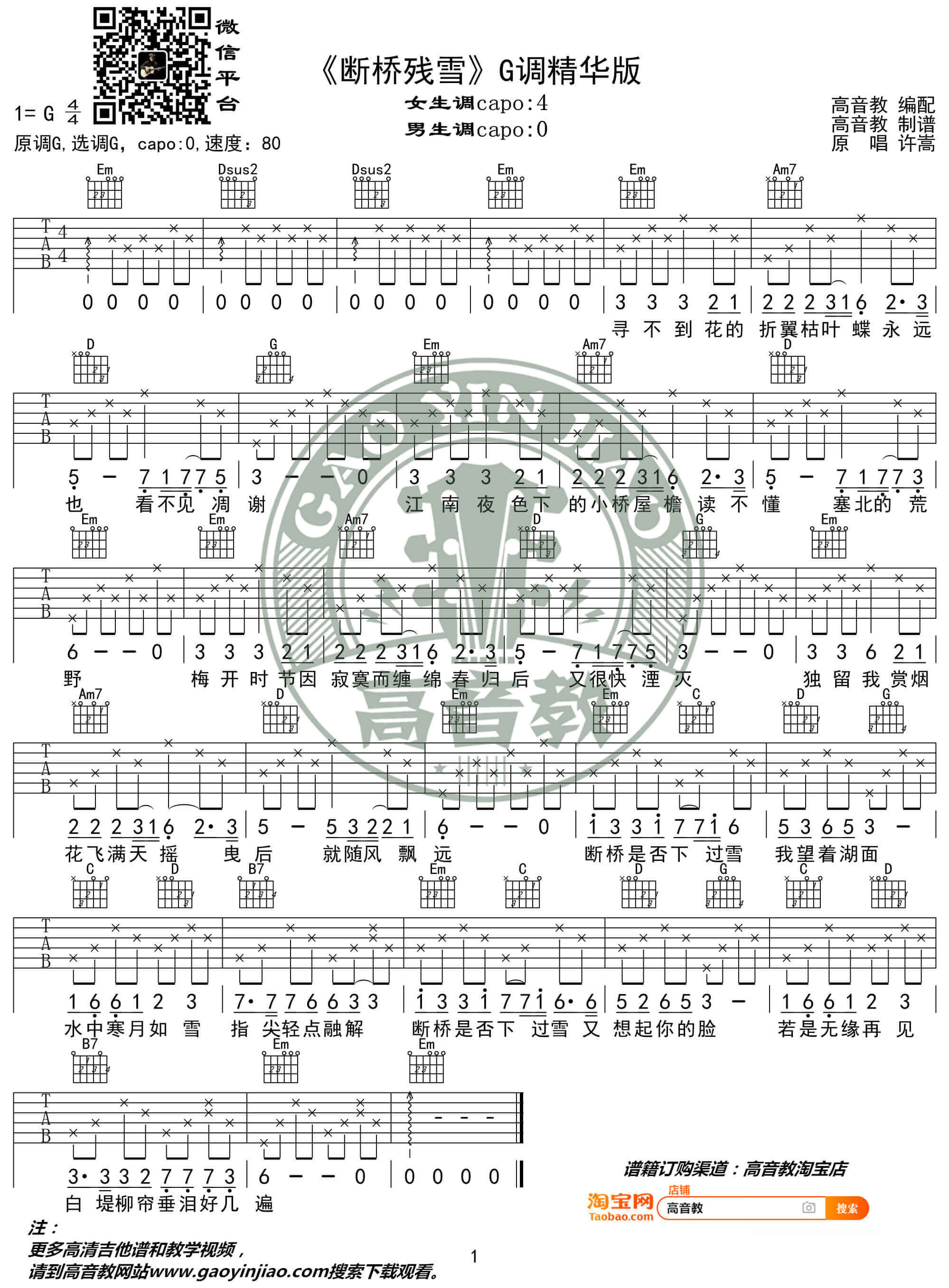 曲谱介绍: 许嵩《断桥残雪》吉他谱,G调精华版六线谱,来自高音教编配,分解和弦伴奏,简单好弹好听,女生弹唱建议变调夹夹第四品。
