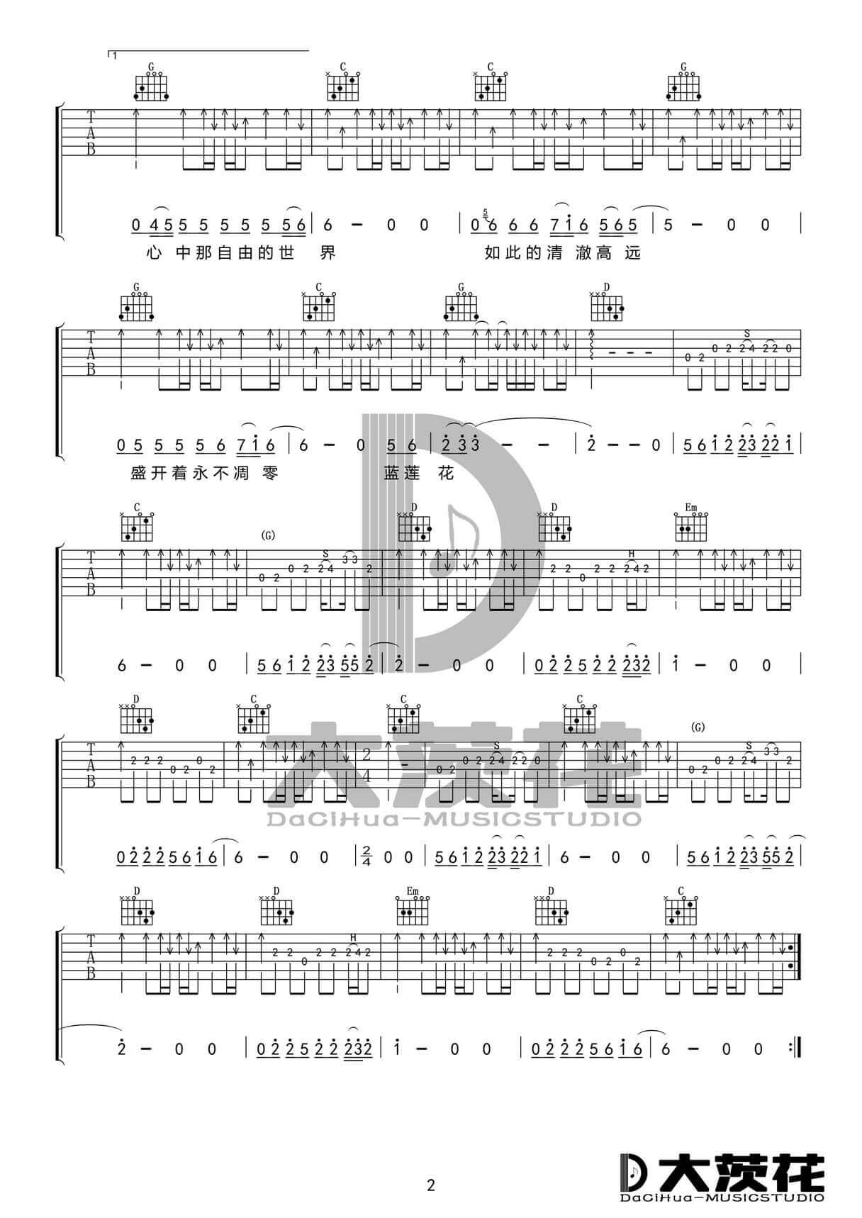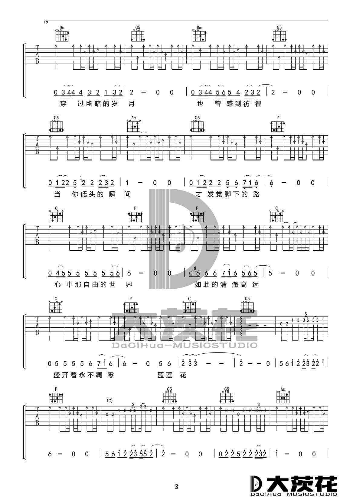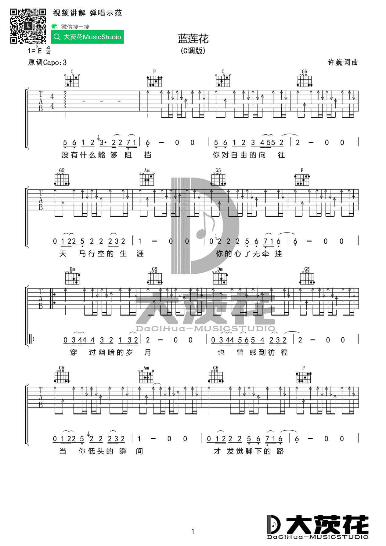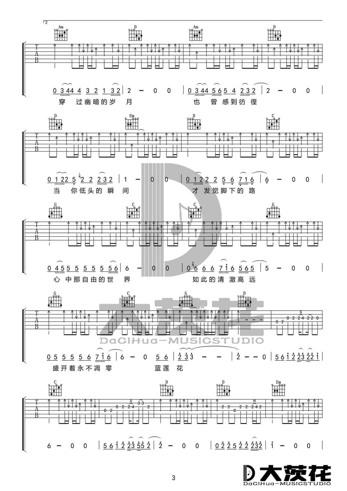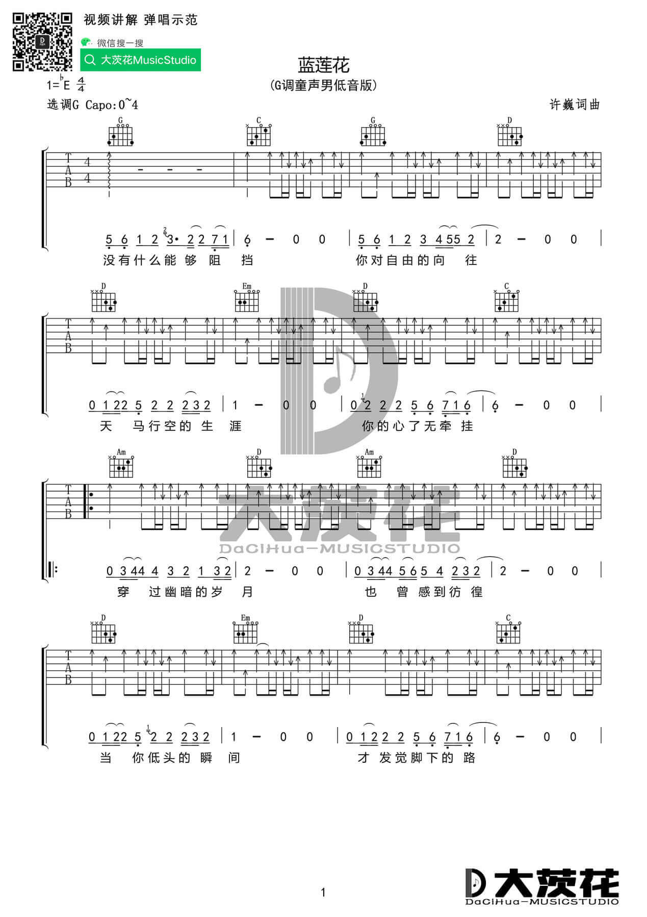 曲谱介绍: 许巍经久不衰的佳作《蓝莲花》,大概所有的人,听到这首歌就会被歌词与旋律深深吸引住。沉稳平静的旋律,却能够给人诸多的思考与感触。 本文是来自小宁编配的《蓝莲花》吉他谱,新编版,丰富了歌曲的间奏尾奏,并提供了两个调式的曲谱,原版指法。