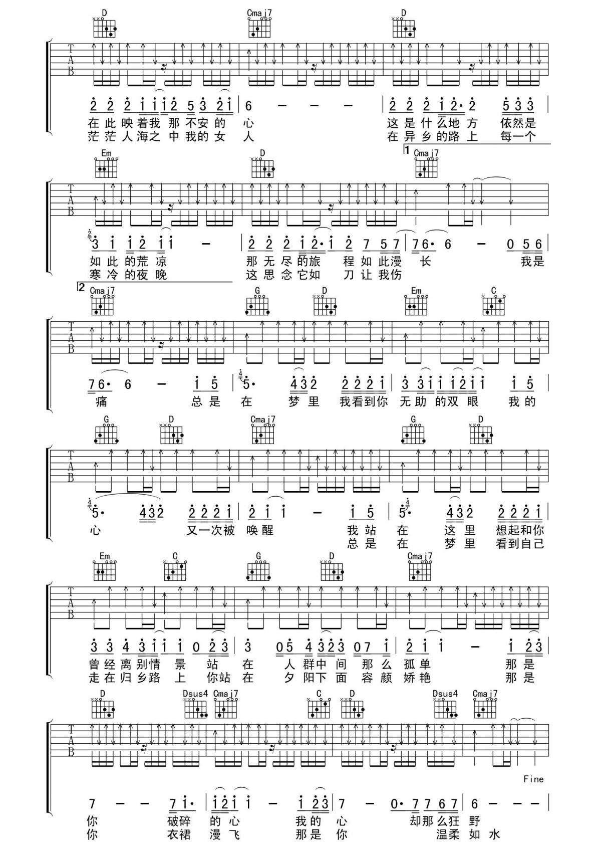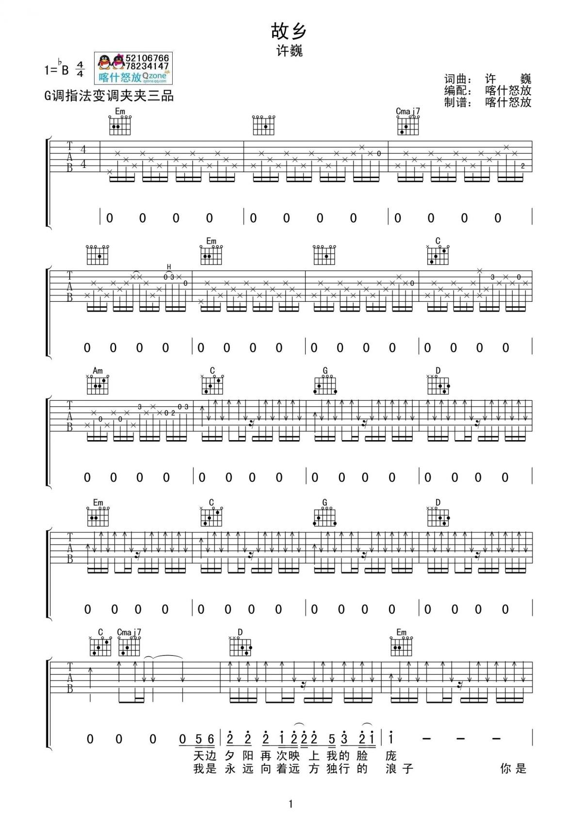 曲谱介绍: 许巍《故乡》吉他弹唱谱,采用G调指法编配,共有2张高清图谱,免翻页排版设计。