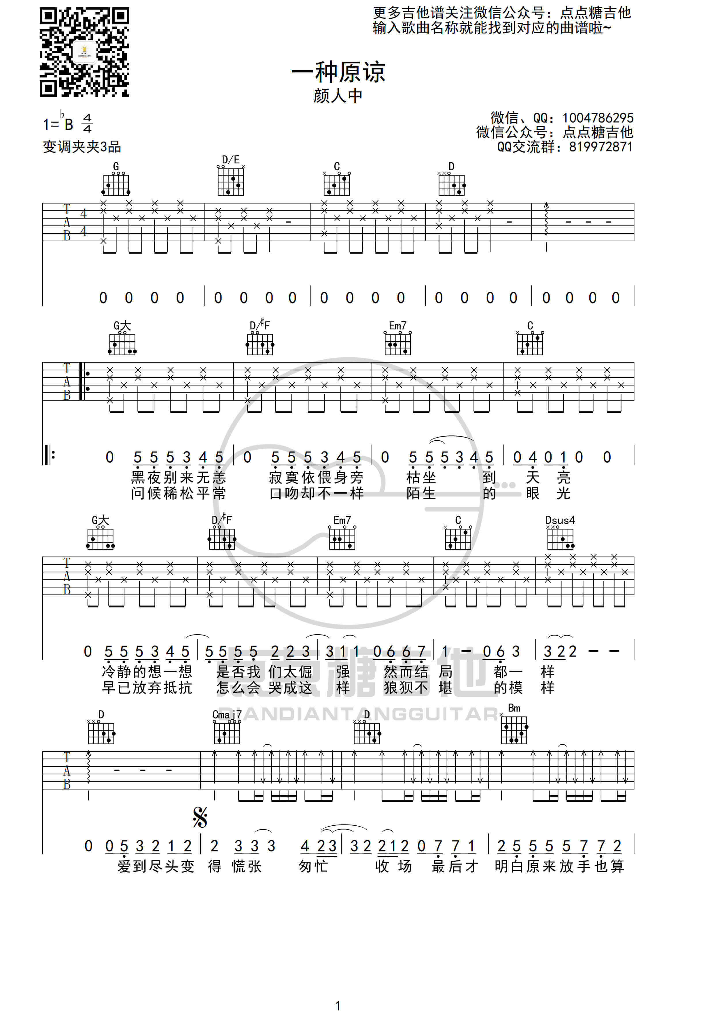 曲谱介绍: 十成温柔配合七分演技换来五封情书及一种原谅。颜人中《一种原谅》吉他谱分享,来自点点糖吉他编配六线谱,G调指法。 1.这首歌原调是bB调,作者选用的是G调指法编配,变调夹夹在吉他的3品位置,主歌半分解,副歌扫弦。 2.主歌和前奏都是半分解的节奏型,难度不大;副歌扫弦的节奏型是4/4拍这类歌曲最常用到的,这个扫弦节奏型我用的最多了,之前编配的很多歌曲也用到过这个节奏型。第三页的时候扫弦第一拍稍微有点变化,前面是一拍一个向下的扫弦,这里变成了一拍两个向下的扫弦。副歌的中间有一个小节是B7和弦全部向下的扫弦,这里可以渐强,突出后面的内容。 3.前奏和尾奏差不多,不同的地方是前奏的最后一个小节是D和弦向下的琶音,而尾奏的最后一个小节是G和弦向上的琶音。