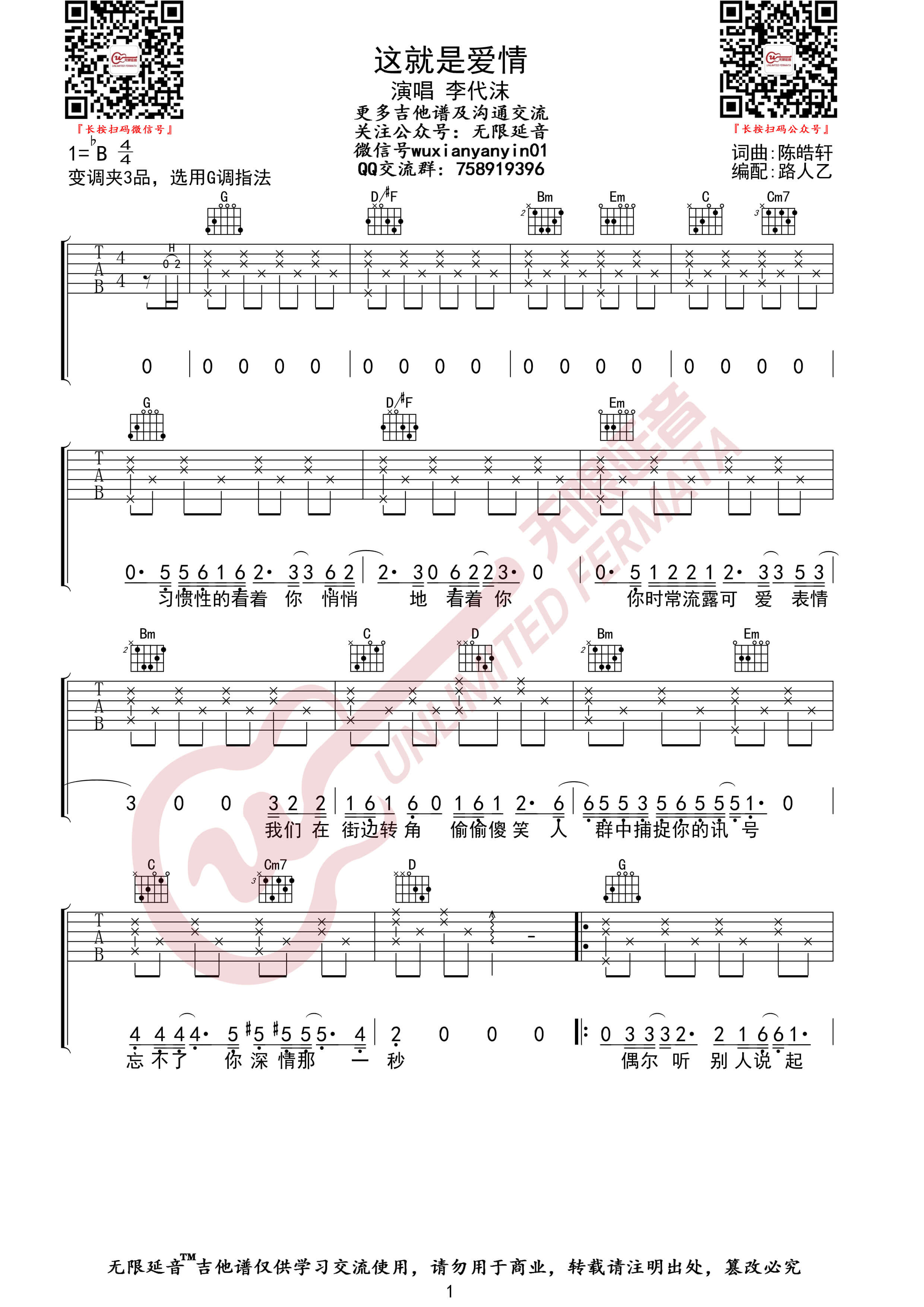 曲谱介绍: 每个人至少有这四个样子:在朋友面前疯癫的样子;在恋人面前完美的样子;只身一人时脆弱的样子;陌生的人群中安安静静地样子。李代沫《这就是爱情》吉他谱分享,来自无限延音编配G调六线谱,原调bB调,弹唱变调夹夹第三品。李代沫用细腻的情感唱出了爱情最好的结局,我们会深情拥抱,我们会一直到老。