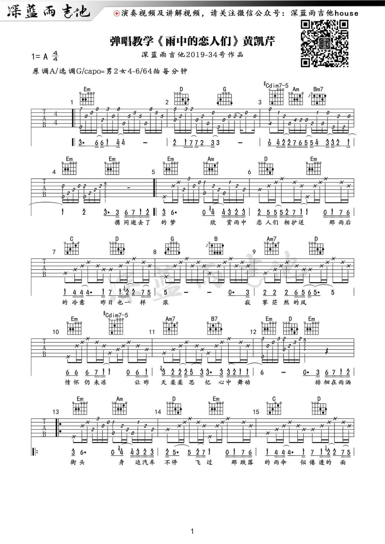曲谱介绍: 怀旧老歌《雨中的恋人们》,来自黄凯芹演唱,90后几乎不知道这个名字,而他堪称音乐诗人的先驱,他的歌总有不一样的味道和柔情。 吉他谱来自深蓝雨吉他编配,G调指法版,原调A调,弹唱男生变调夹夹二品,女生夹4-6品。歌曲前奏和间奏部分的solo较难,大家可以在视频讲解里跟老师深度学习。 吉他弹唱演示及视频教学