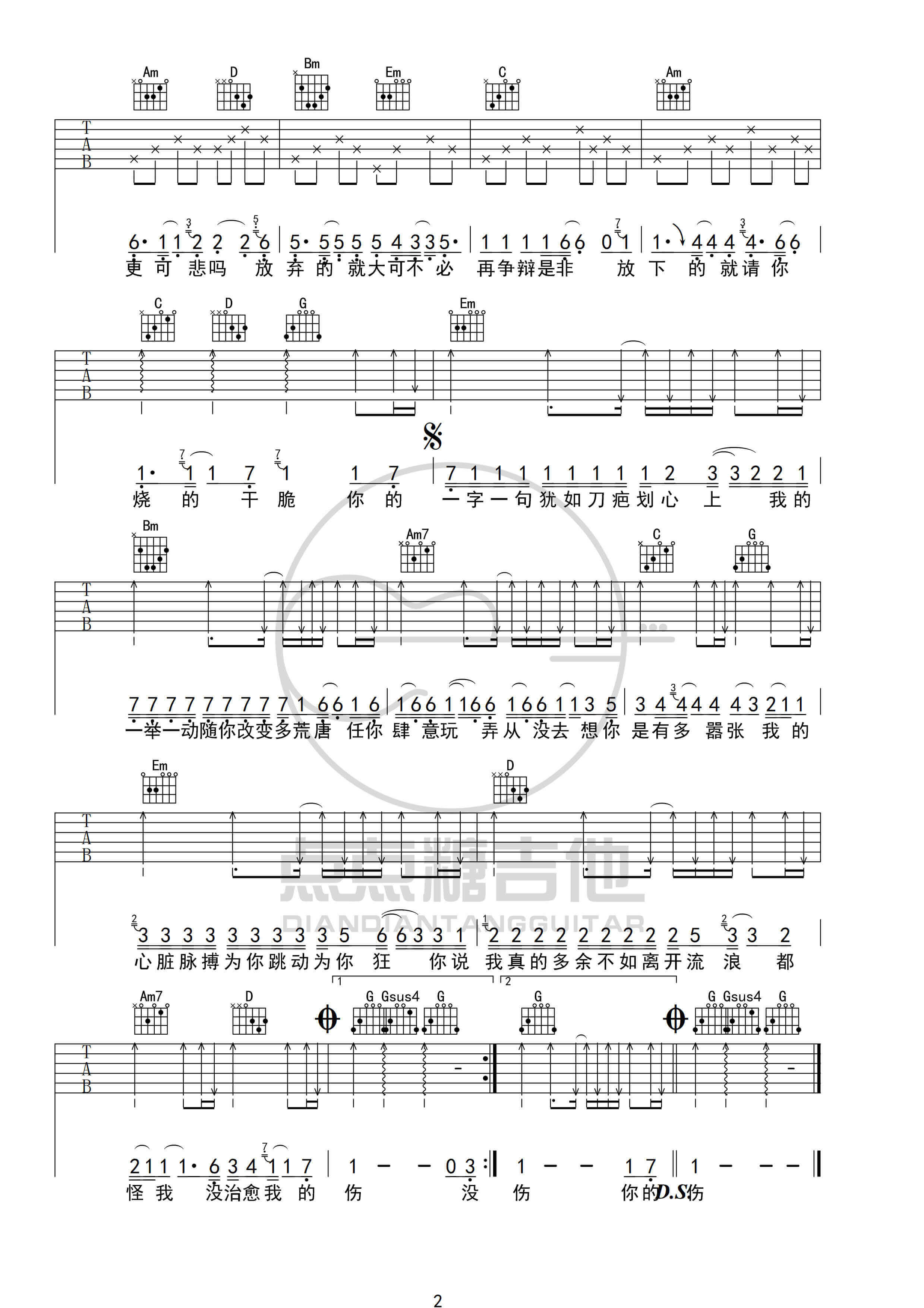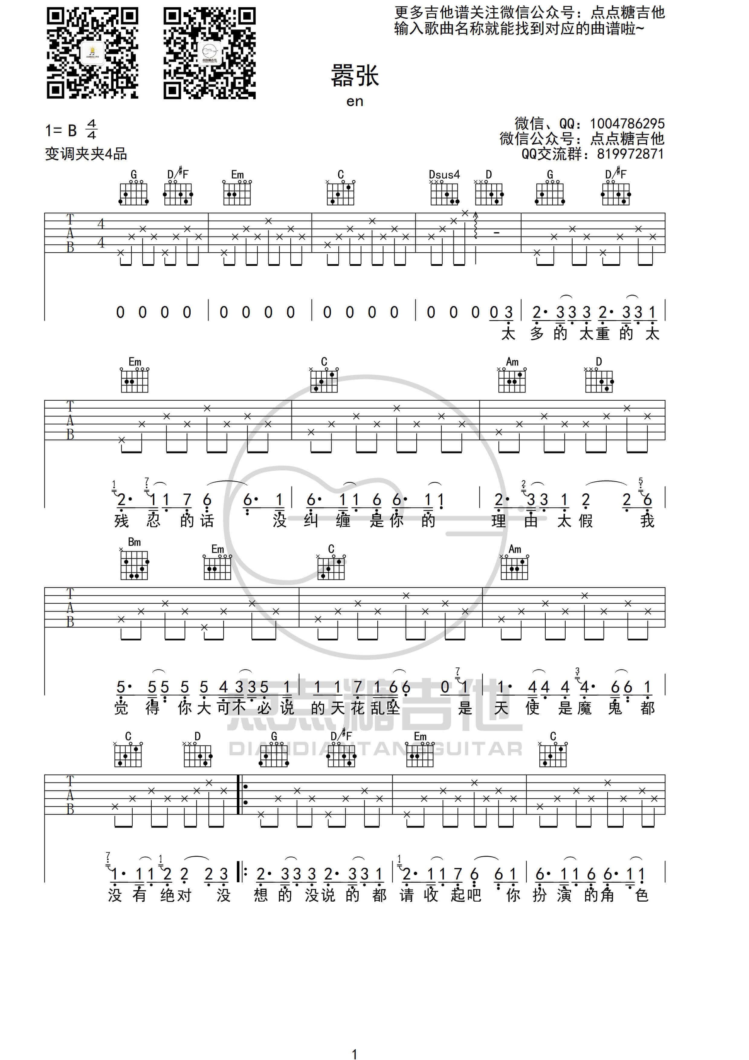 曲谱介绍: 《嚣张》吉他谱分享,来自点点糖吉他编配高清G调六线谱,附上编配说明: 1.这首歌原调是B调,我选用的是G调指法,变调夹夹在吉他的4品位置,主歌分解,副歌扫弦。 2.主歌和副歌的音跨度很大,从简谱上就可以看出来,所以这就导致了主歌好唱,副歌有点难度,我在扒谱的时候试着唱了一下,主歌还好,副歌堪称车祸现场,所以如果大家觉得副歌不好唱的话可以选择降调(大神请忽略),变调夹夹在2品。 3.谱子上第一遍唱完后就直接反复了,是因为间奏和前奏一样,大家按照前奏弹间奏就行了。这样也是省略了第三页,避免翻页,方便弹唱。