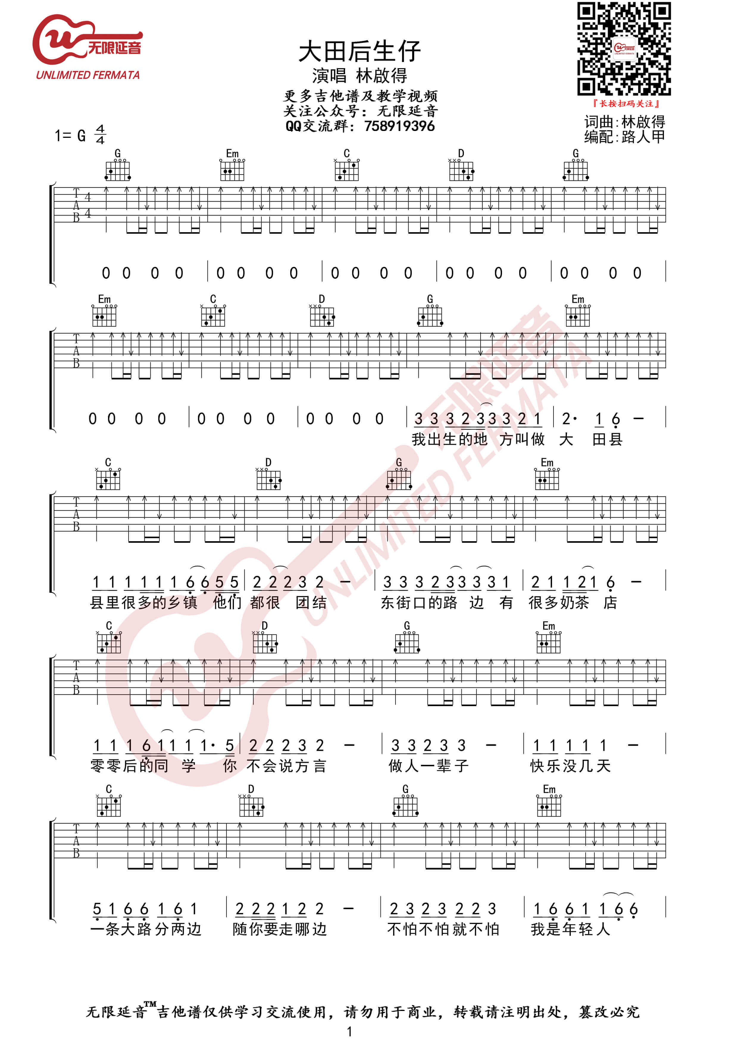大田后生仔吉他谱 - 林启得 - G调吉他弹唱谱