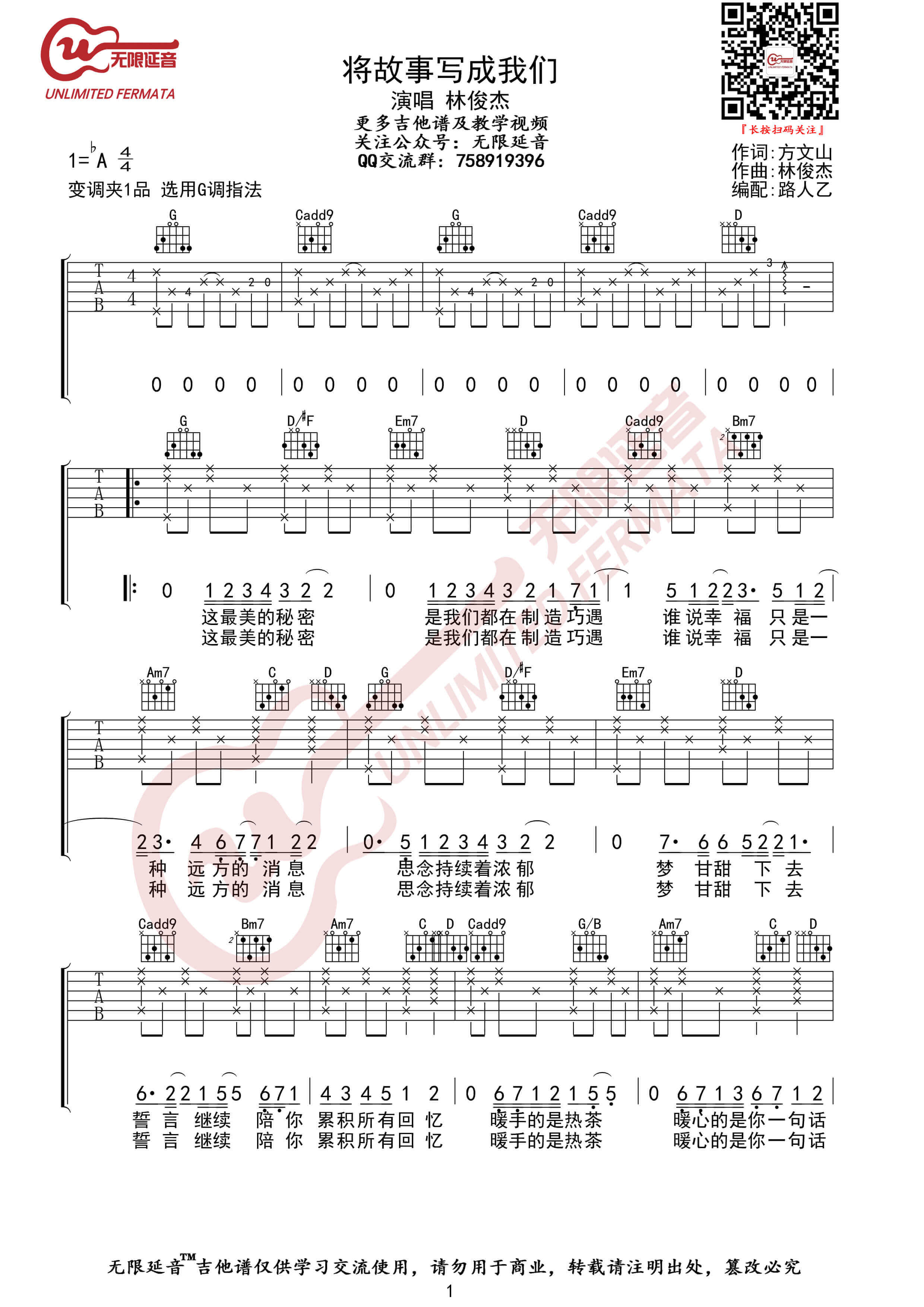 曲谱介绍: 林俊杰《将故事写成我们》吉他谱分享,来自无限延音编配G调版弹唱伴奏谱,原调bA,弹唱变调夹夹第一品。