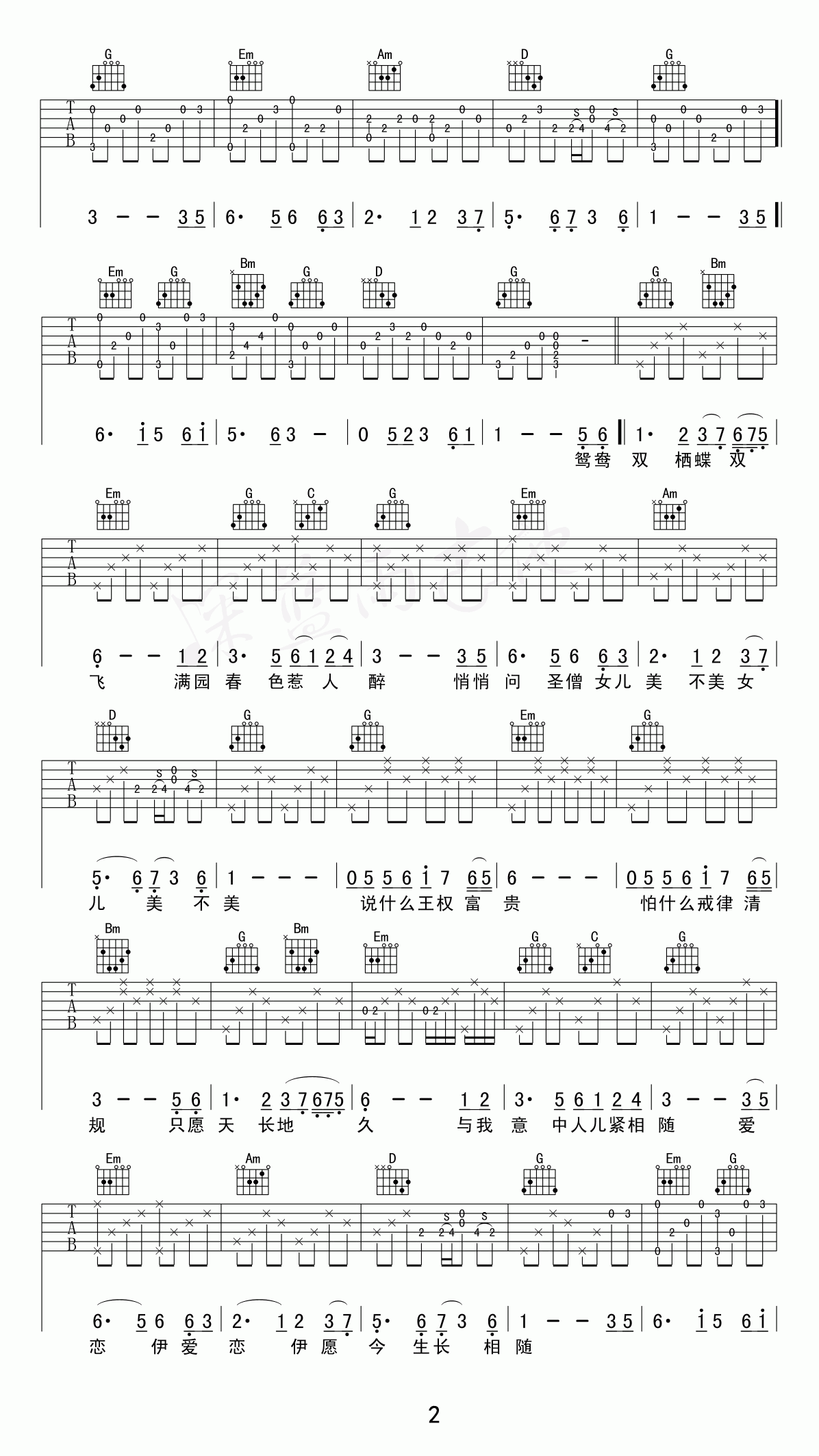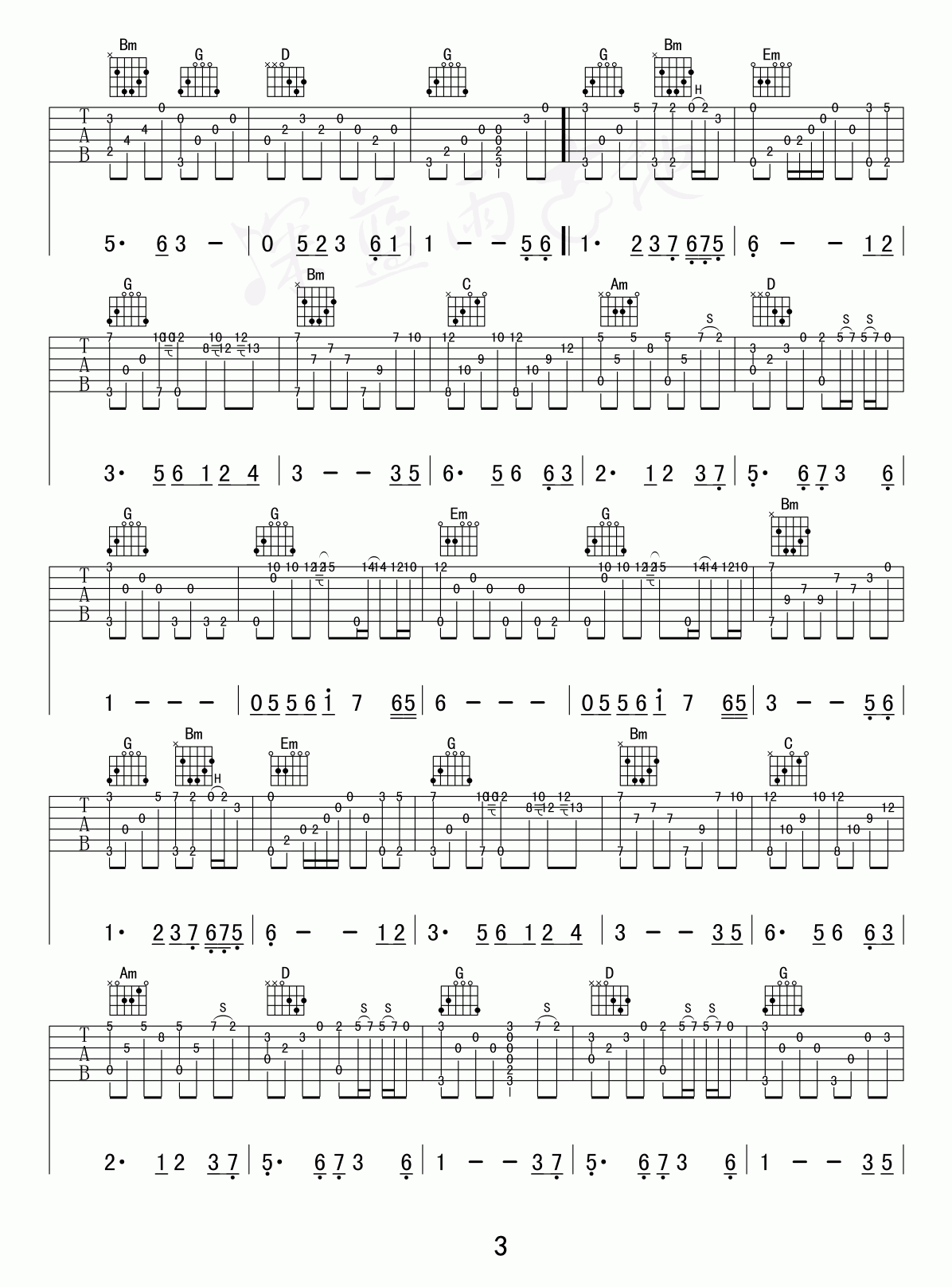 曲谱介绍: 《女儿情》吉他弹唱谱,采用G调指法编配,共有3张高清图谱。