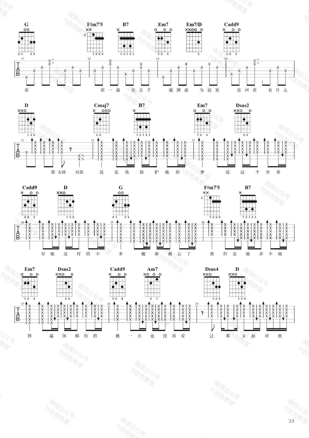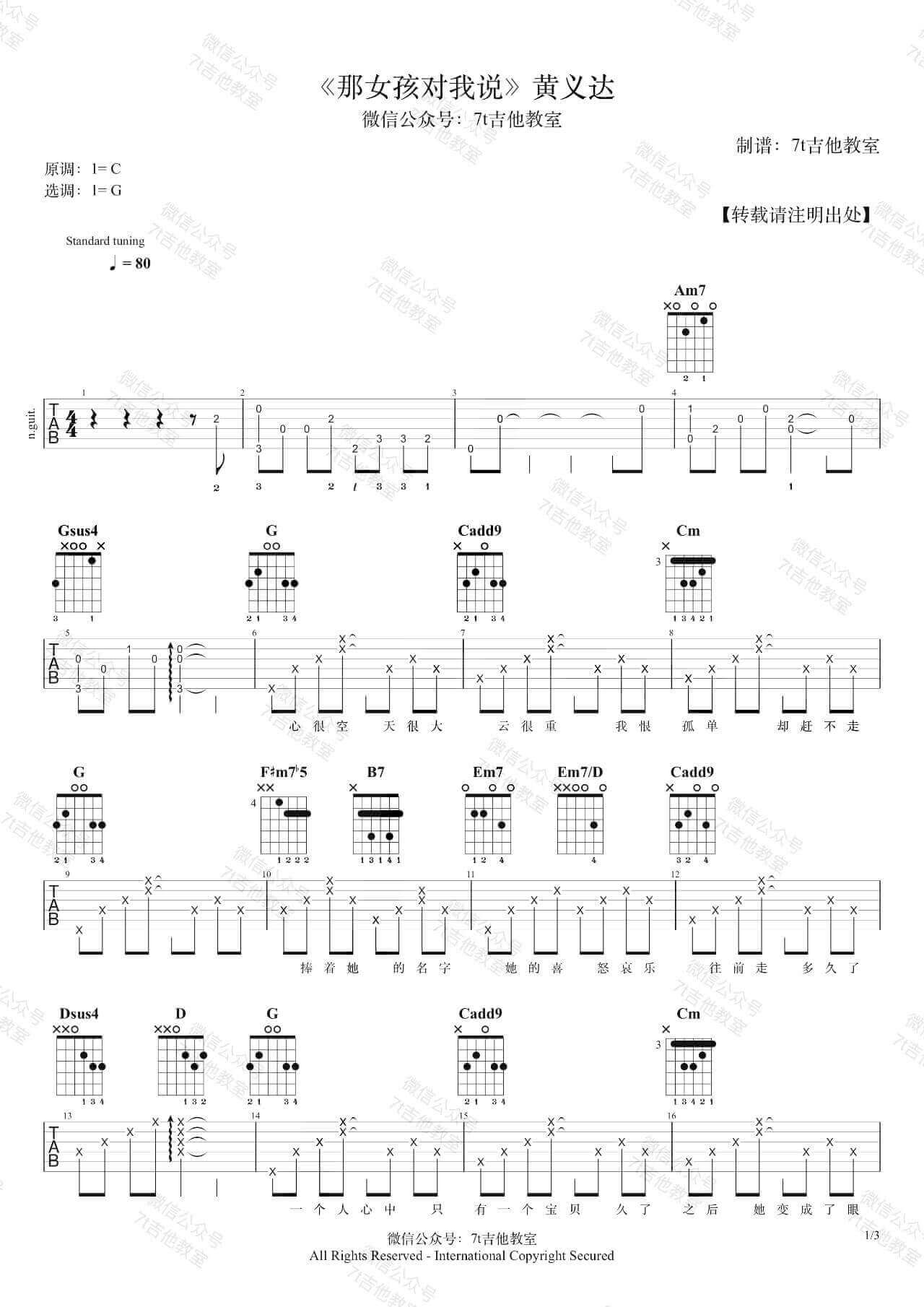 曲谱介绍: 那女孩对我说,说我保护她的梦。这是多少痴男怨女的青春写照,黄义达的声音中藏着深深的无能为力,爱对了是爱情,爱错了便是青春。来自7t吉他教室编配《那女孩对我说》吉他谱分享,这里老师用的是G大调的指法来编配,视频里是标准音调弦,没有用变调夹,适合音域较低的男生。想唱原调的童鞋可以使用变调夹,夹在第5品就可以哦! 吉他弹唱演示及视频教学 《那女孩对我说》吉他弹唱示范 其他版本吉他谱:《那女孩对我说》吉他谱_黄义达_高清六线谱C调版