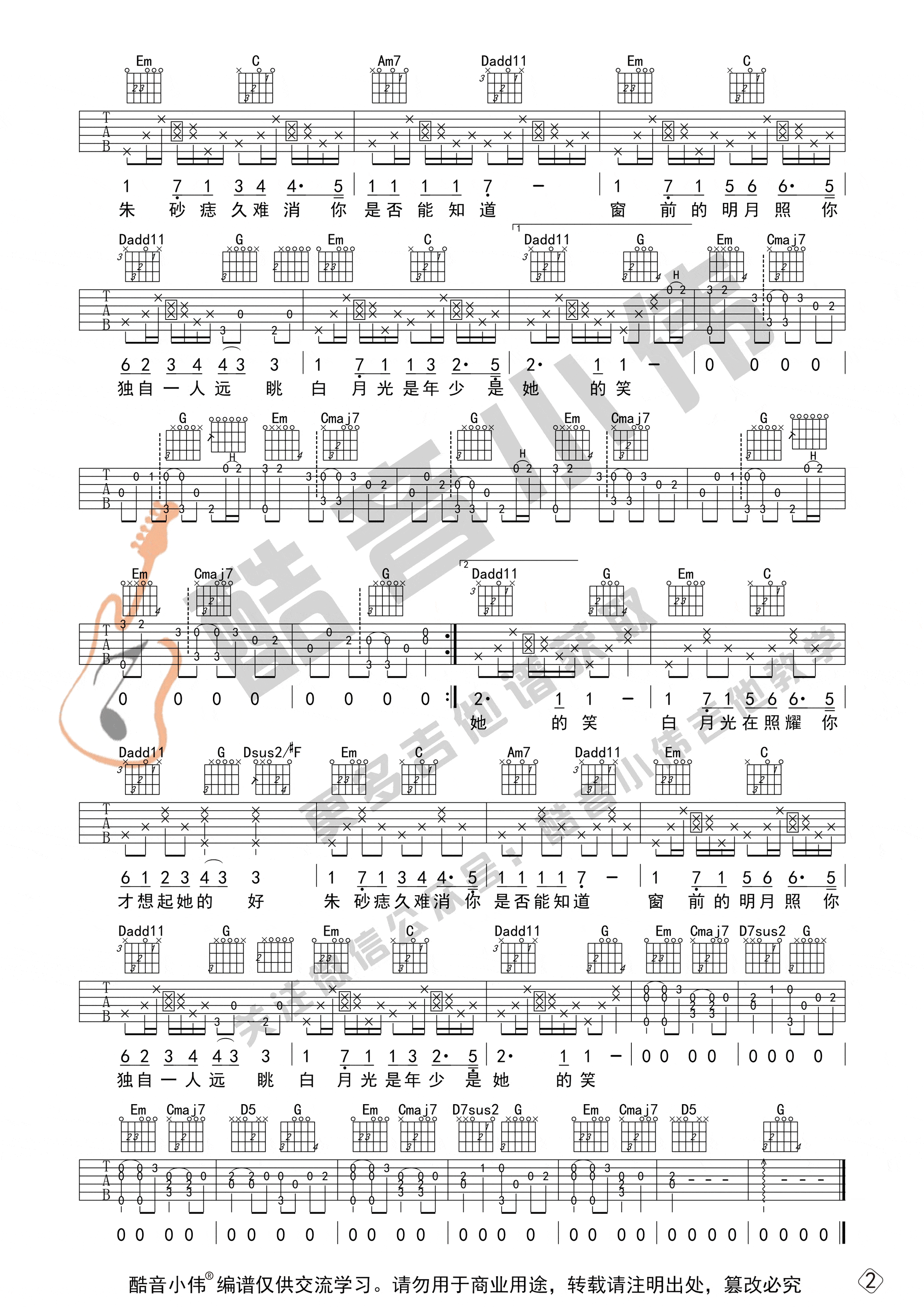 曲谱介绍: 曲谱适合有一定基础的琴友弹奏,选用G调指法,变调夹的位子可以根据我的推荐来选择。使用八分音符分解伴奏型,练习帮助提升水平,先弹奏会曲谱,再清唱会,然后弹唱结合一起练习。《白月光与朱砂痣》是由大籽演唱的歌曲,“寄予希望却无法拥有的叫白月光,拥有却无法再拥抱的人叫朱砂痣”。将白月光朱砂痣串联了起来,用作比喻爱情。白月光朱砂痣是你内心的美好,你的向往,你的梦想,你的抱负。另外,和这首一样赞的小宇吉他谱也非常NICE,大家快去学习吧! 吉他弹唱演示及视频教学