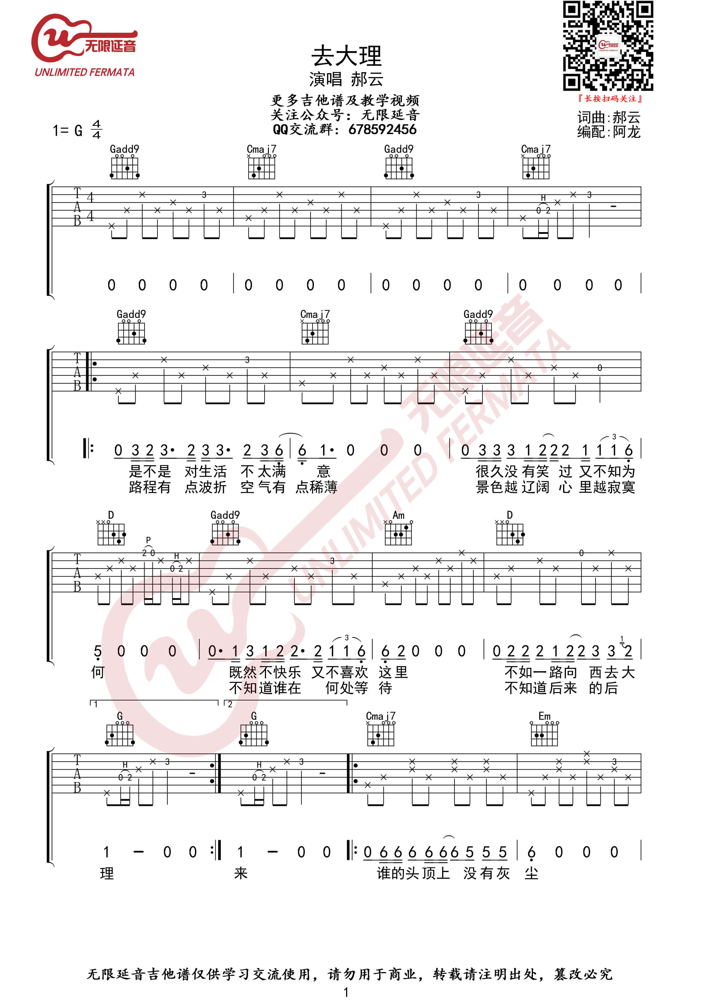 曲谱介绍: 郝云《去大理》吉他弹唱谱,采用G调指法编配,共有2张高清图谱,免翻页排版设计。