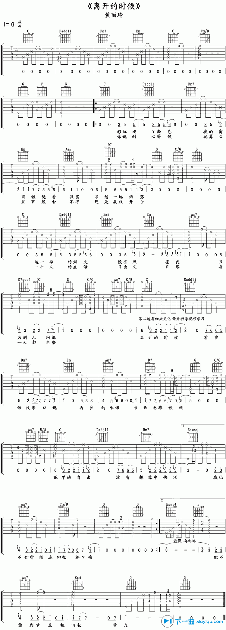 曲谱介绍: 离开的时候吉他谱采用了G调指法,由下一曲编配完成。在这首歌曲之中,虽然只是简简单单的几个字,但是却能够把离别的悲伤表现了出来,在歌曲的演唱方面,黄丽玲的嗓音深情而有韵味,深深地唱进了我们每一个人的心里。号外:在这里小编要推荐这首忘记时间吉他谱,它也很好听,大家赶快学习起来啦,不要犹豫!