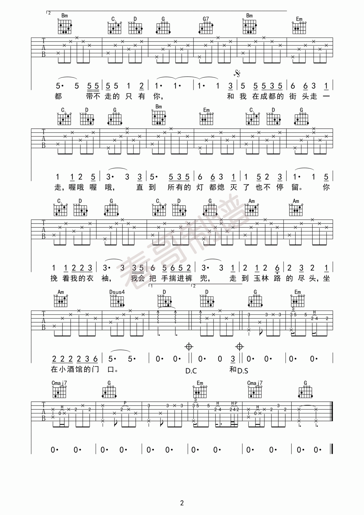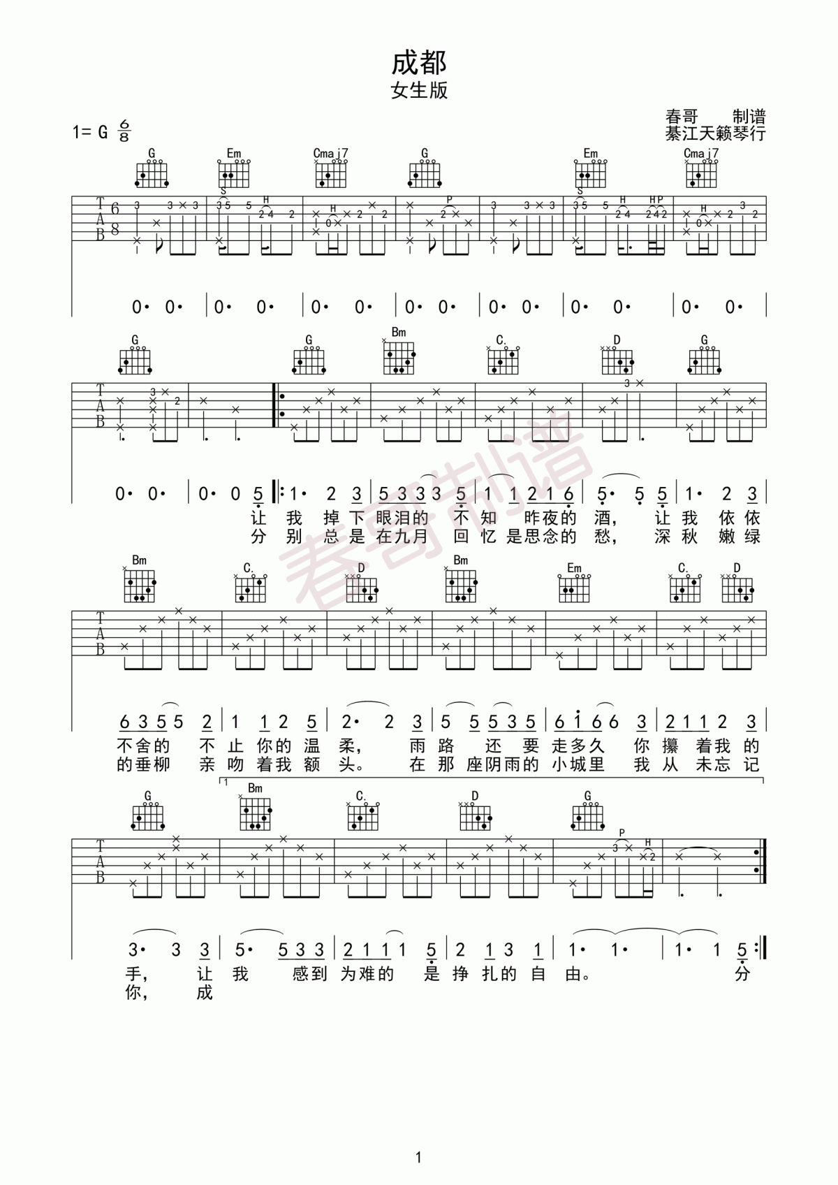 曲谱介绍: 成都指弹吉他谱。赵雷的原创民歌改编,成都吉他独奏曲。高清晰度图片五张,感谢小雷吉他的编辑、上传和分享。音乐简析:成都这首歌是一个民间必修的剧目,这首指法音乐也很容易演奏!难度:6级
