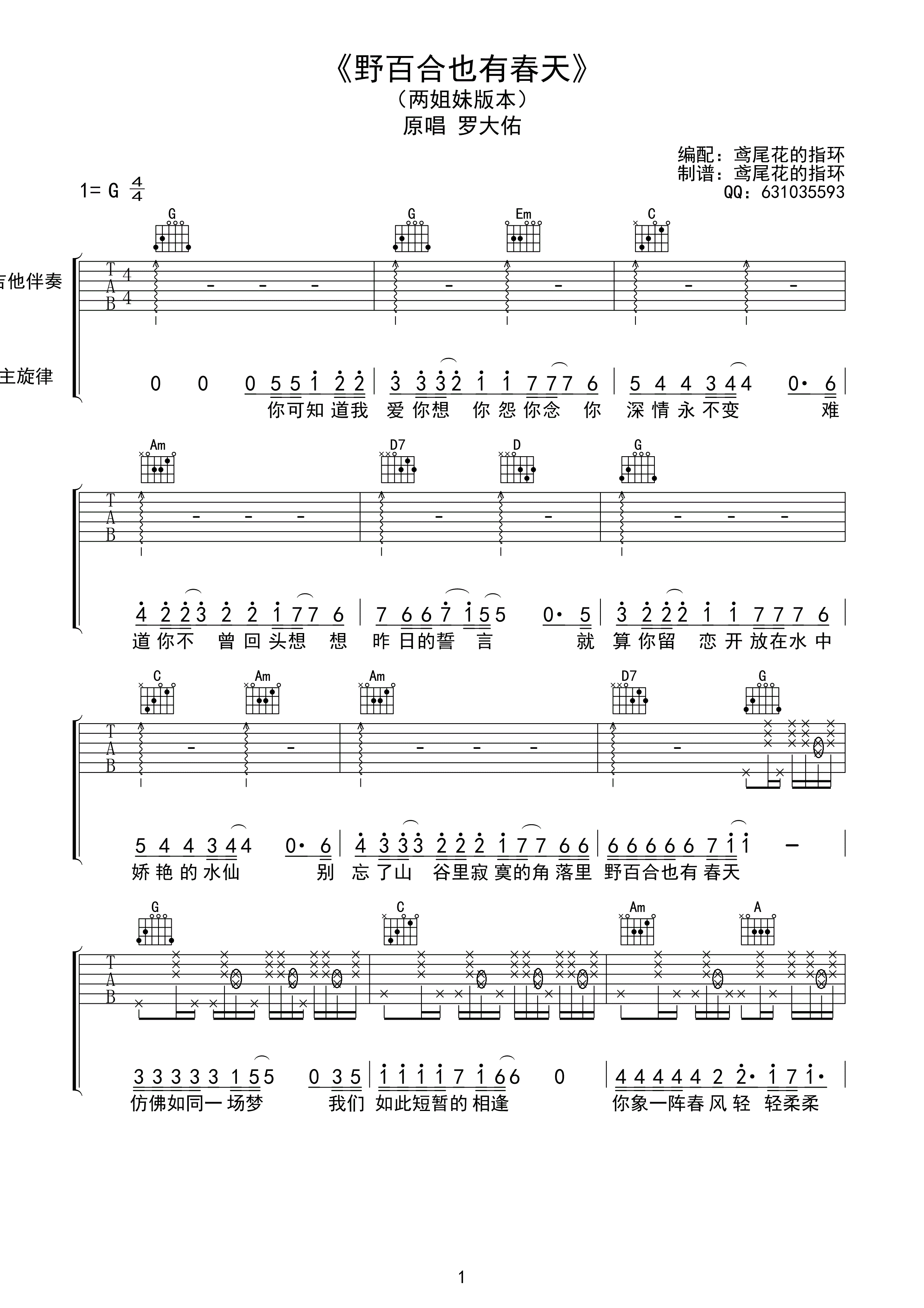 野百合也有春天吉他谱 - 罗大佑 - G调吉他弹唱谱