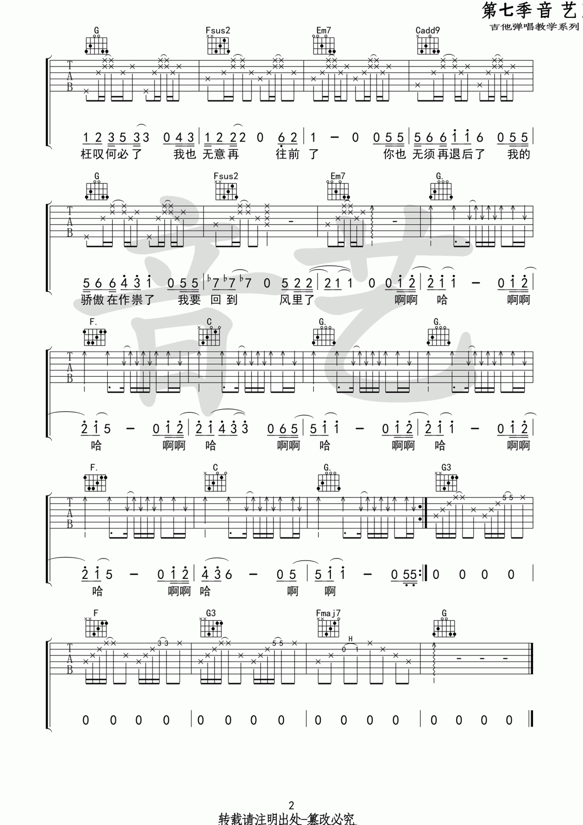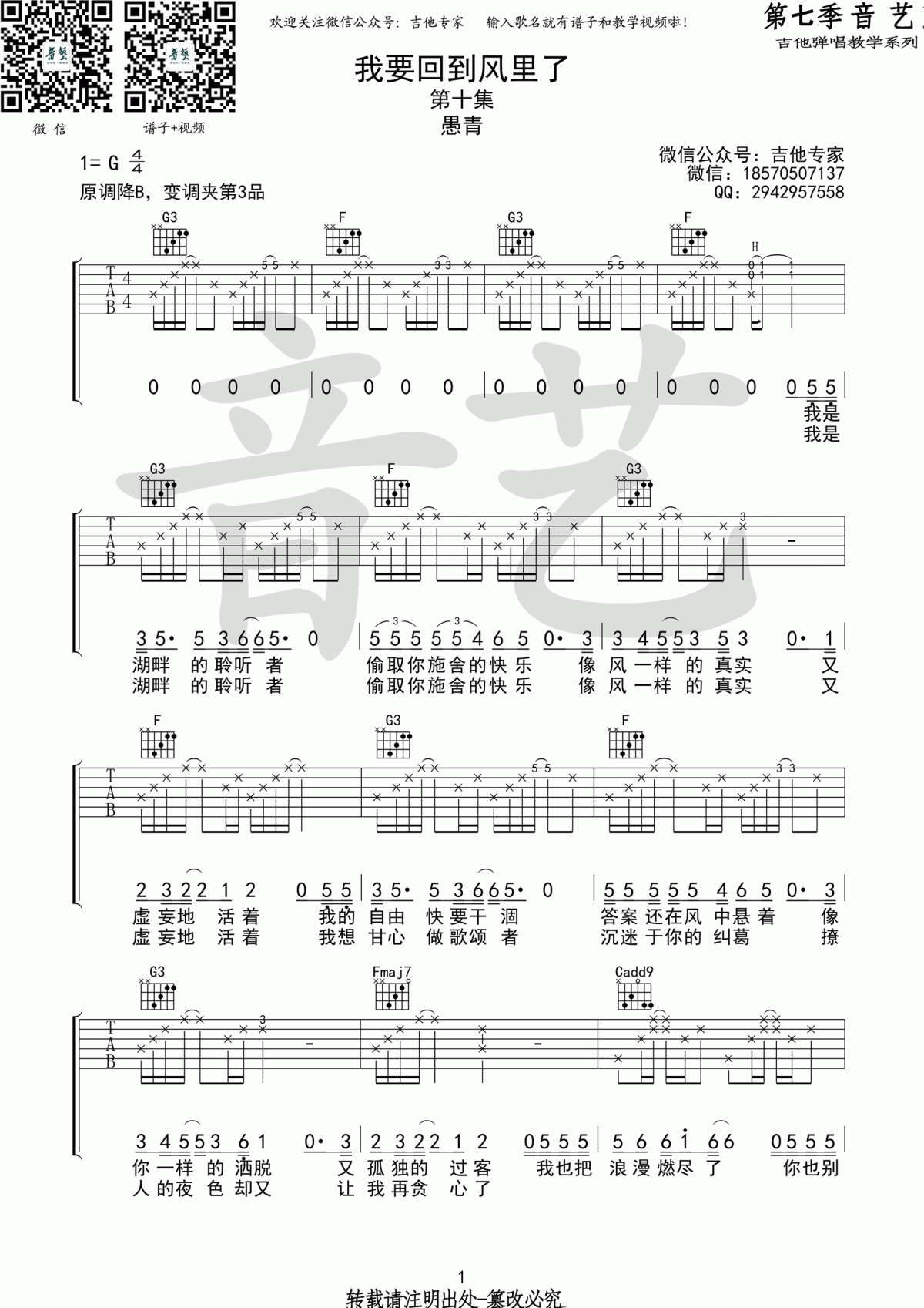 曲谱介绍: 愚青《我要回到风里了》吉他弹唱谱,采用G调指法编配,共有2张高清图谱,免翻页排版设计。
