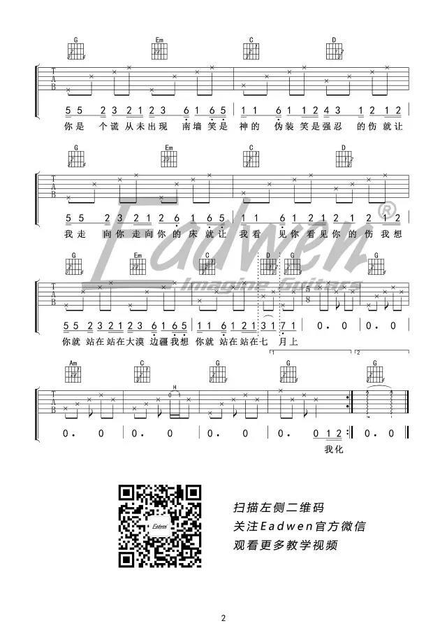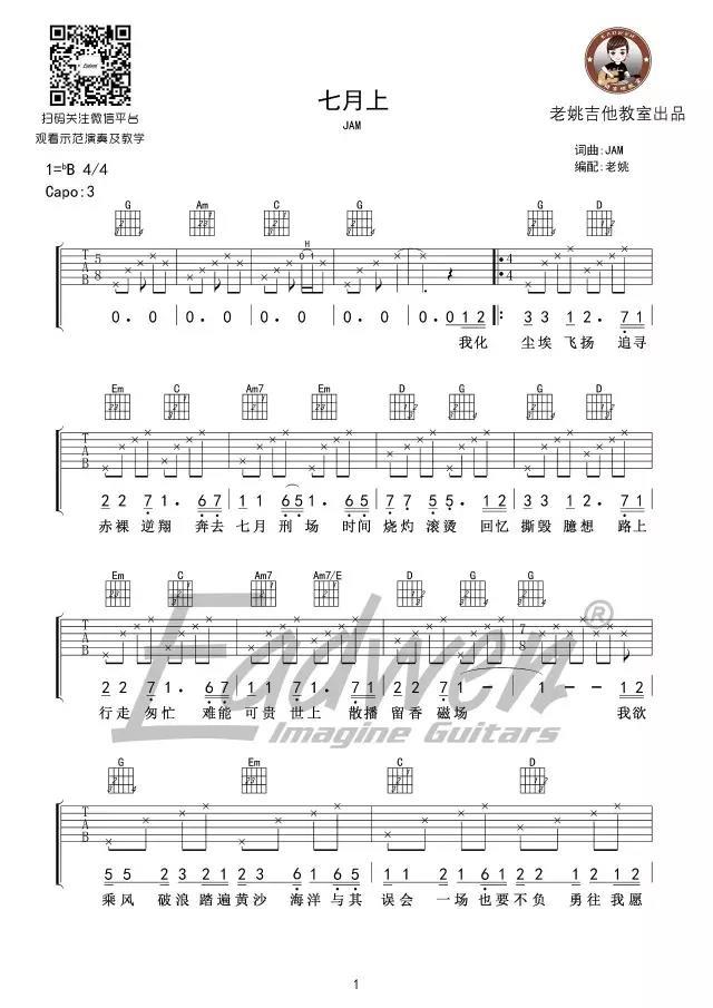 曲谱介绍: 七月上《七月上_降B调》吉他弹唱谱,采用B调指法编配,共有2张高清图谱,免翻页排版设计。