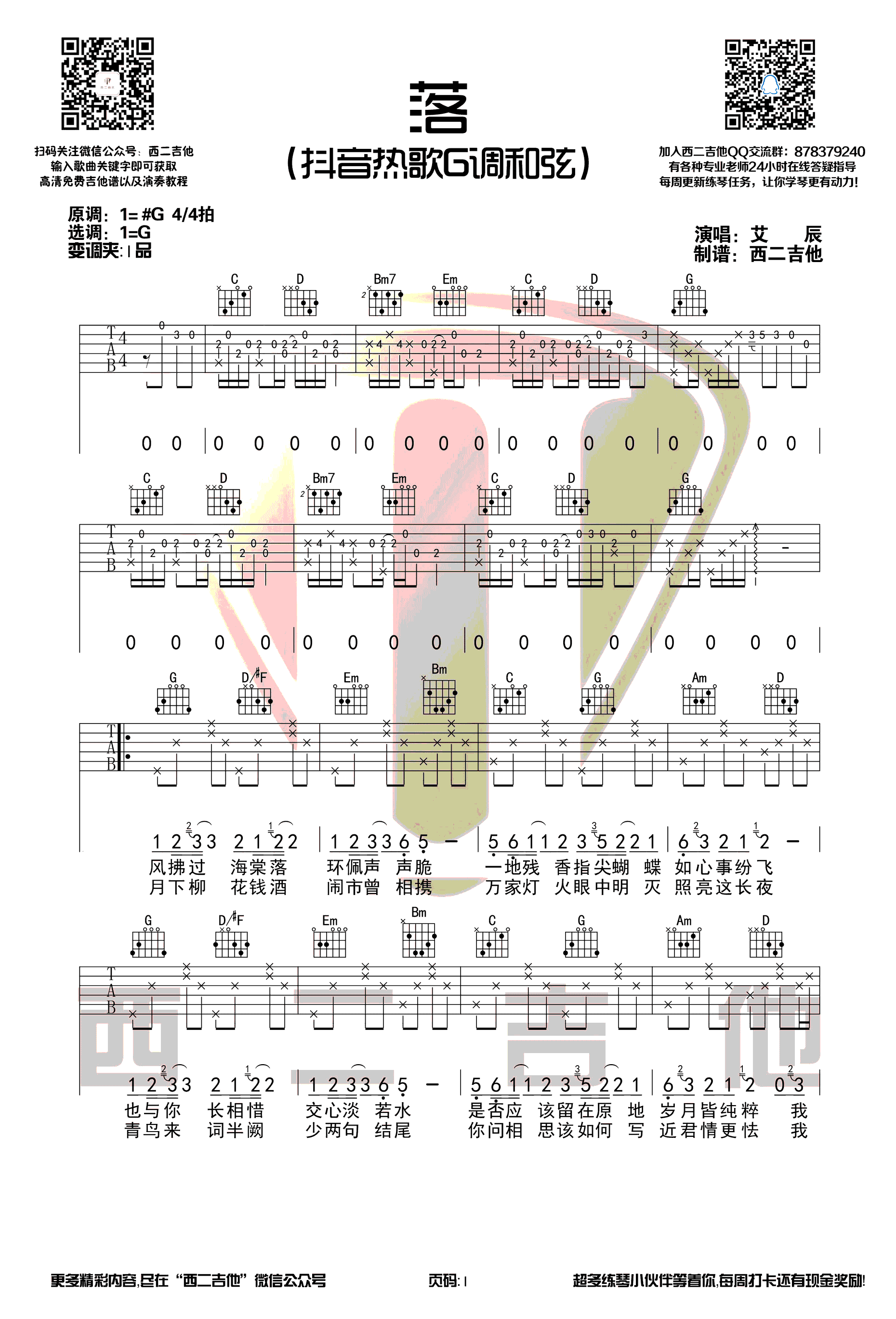 落吉他谱 - 艾辰 - G调吉他弹唱谱