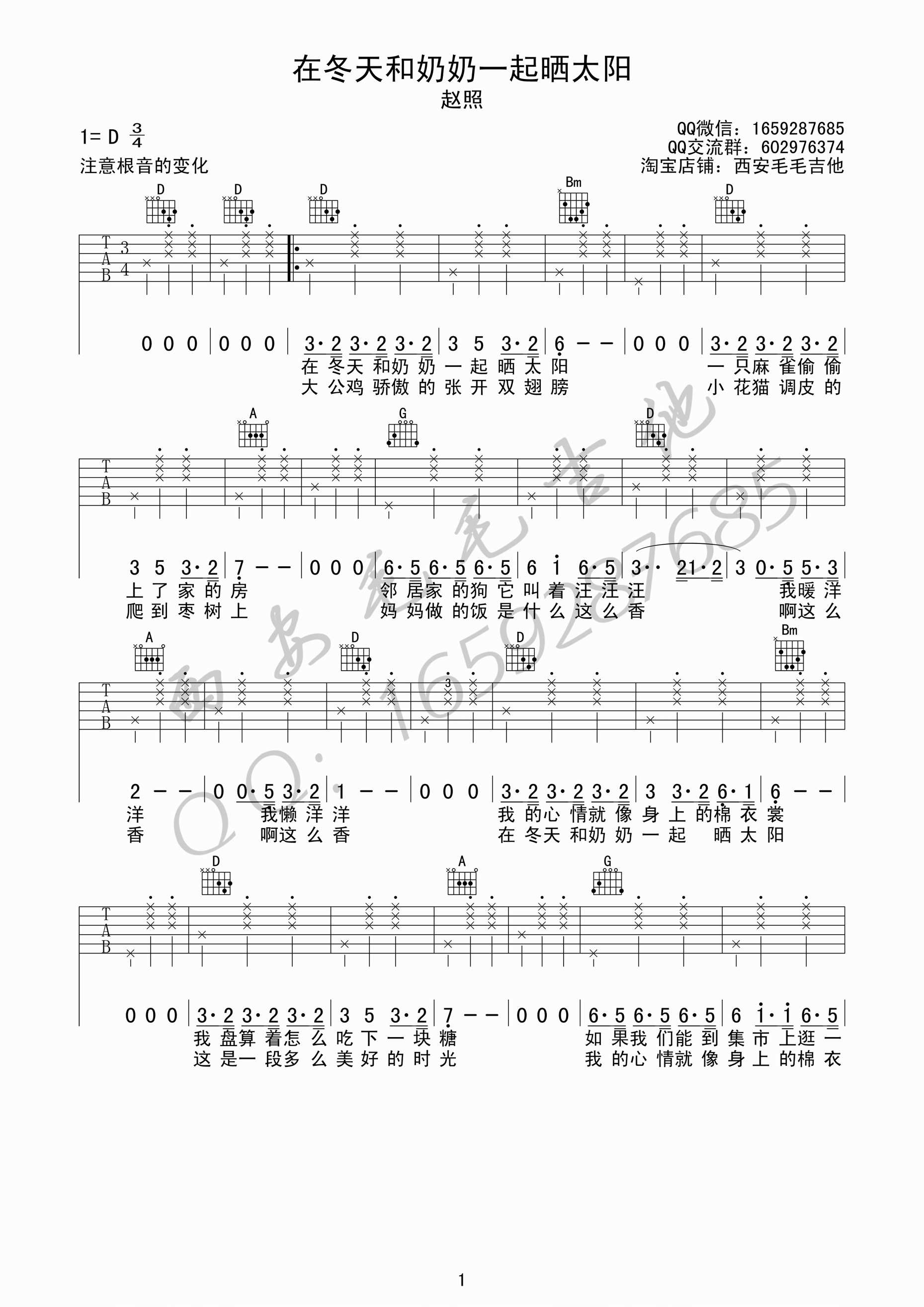 在冬天和奶奶一起晒太阳吉他谱 - 赵照 - D调吉他弹唱谱