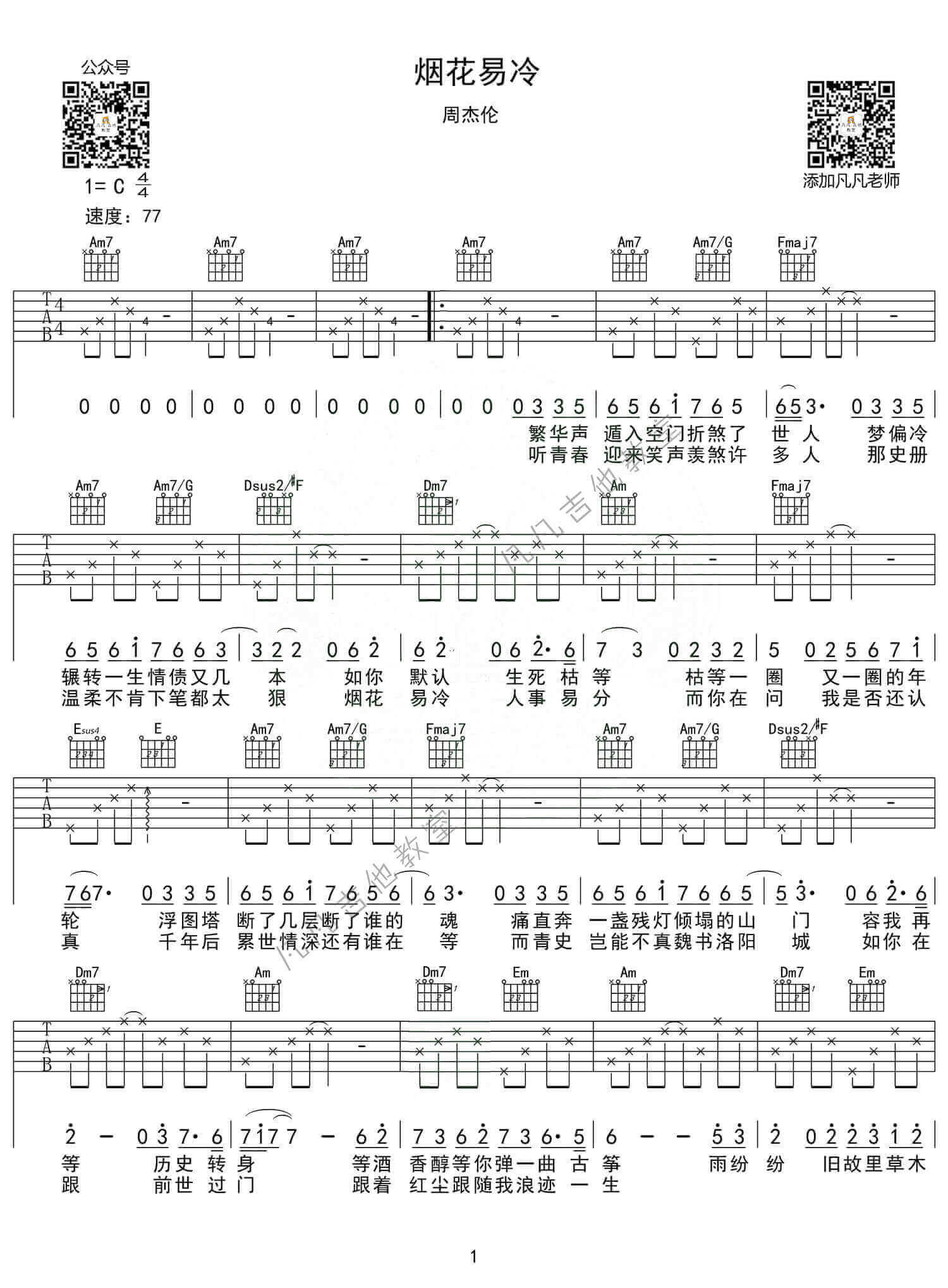 曲谱介绍: 烟花易冷吉他谱采用了G调指法,由凡凡吉他教室完成。是周杰伦作曲并演唱的一首歌曲,这首歌歌词古典优美,意境深远。该曲以北魏洛阳城为背景,古典意味浓郁,旋律优美动听,历史感深邃。TIPS:在这里向大家推介另外一首,它就是这,就是爱吉他谱啦,非常动听的一首曲子!